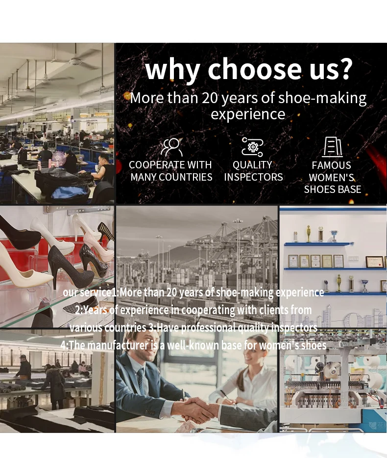 High heels, sandals, flats, slippers, boots4. Why do you want to purchase from us instead of from othersuppliers?We have rich experience in shoe-making and first-class service, andwe are located in a well-known women's shoe production base.