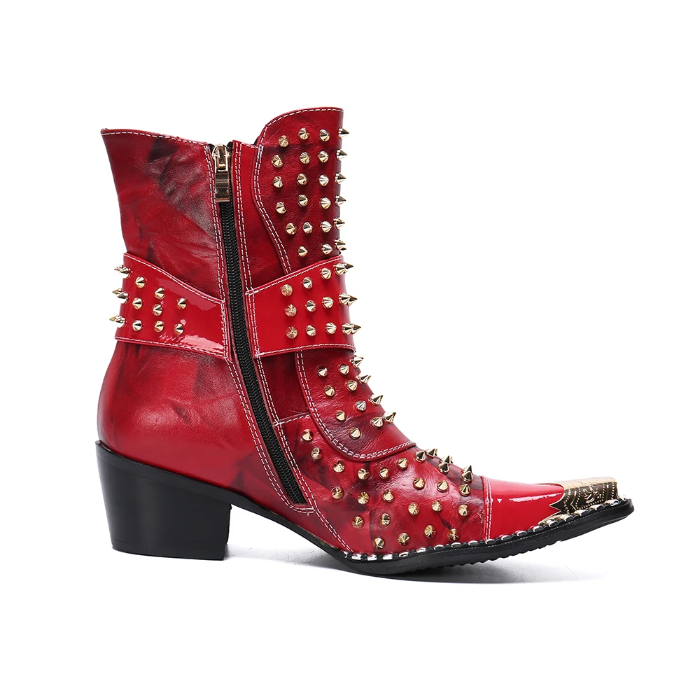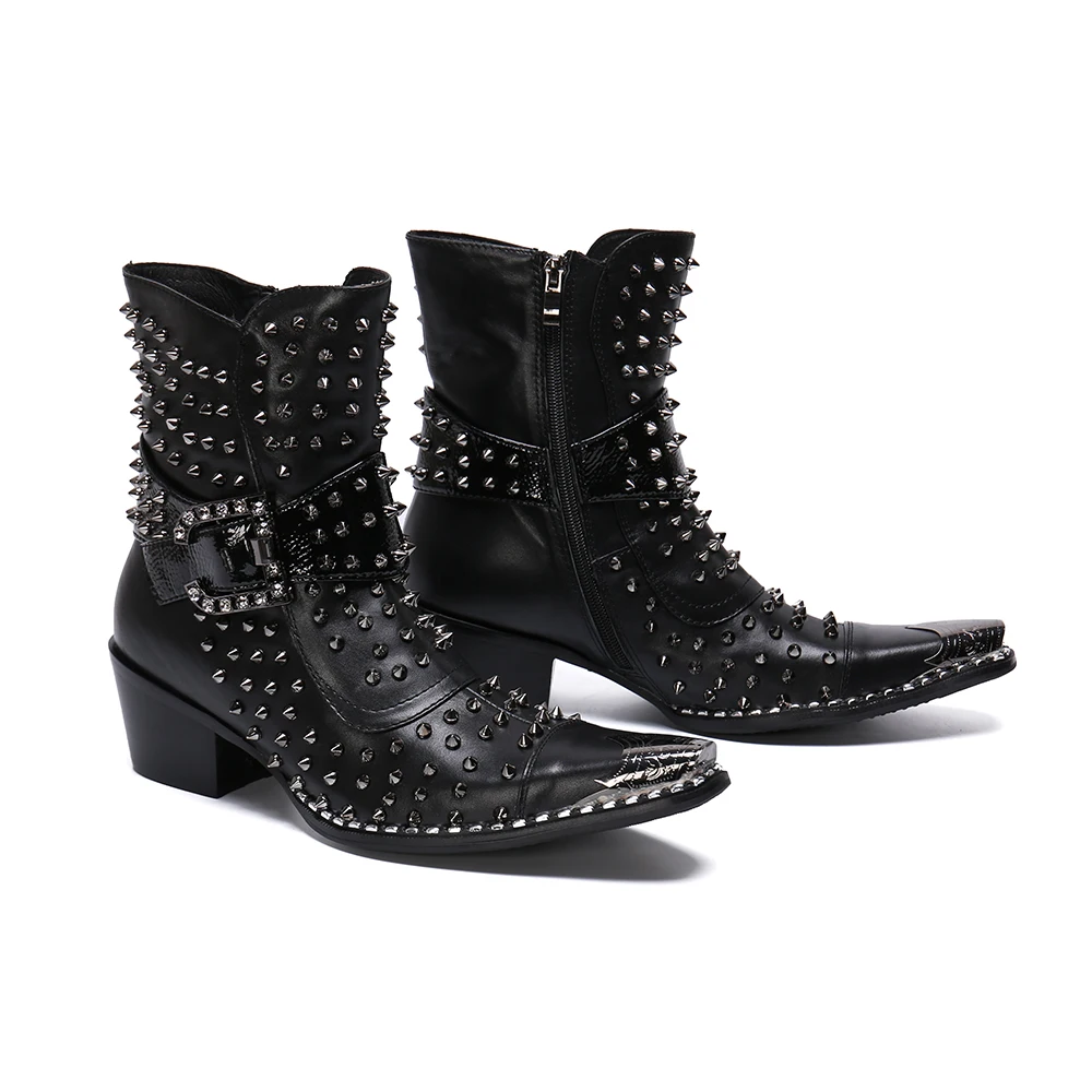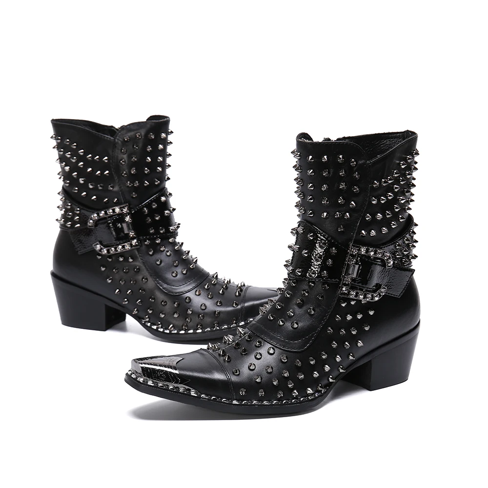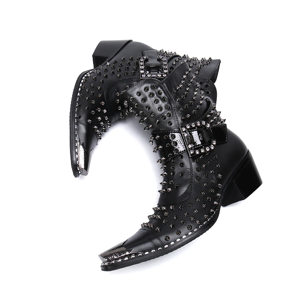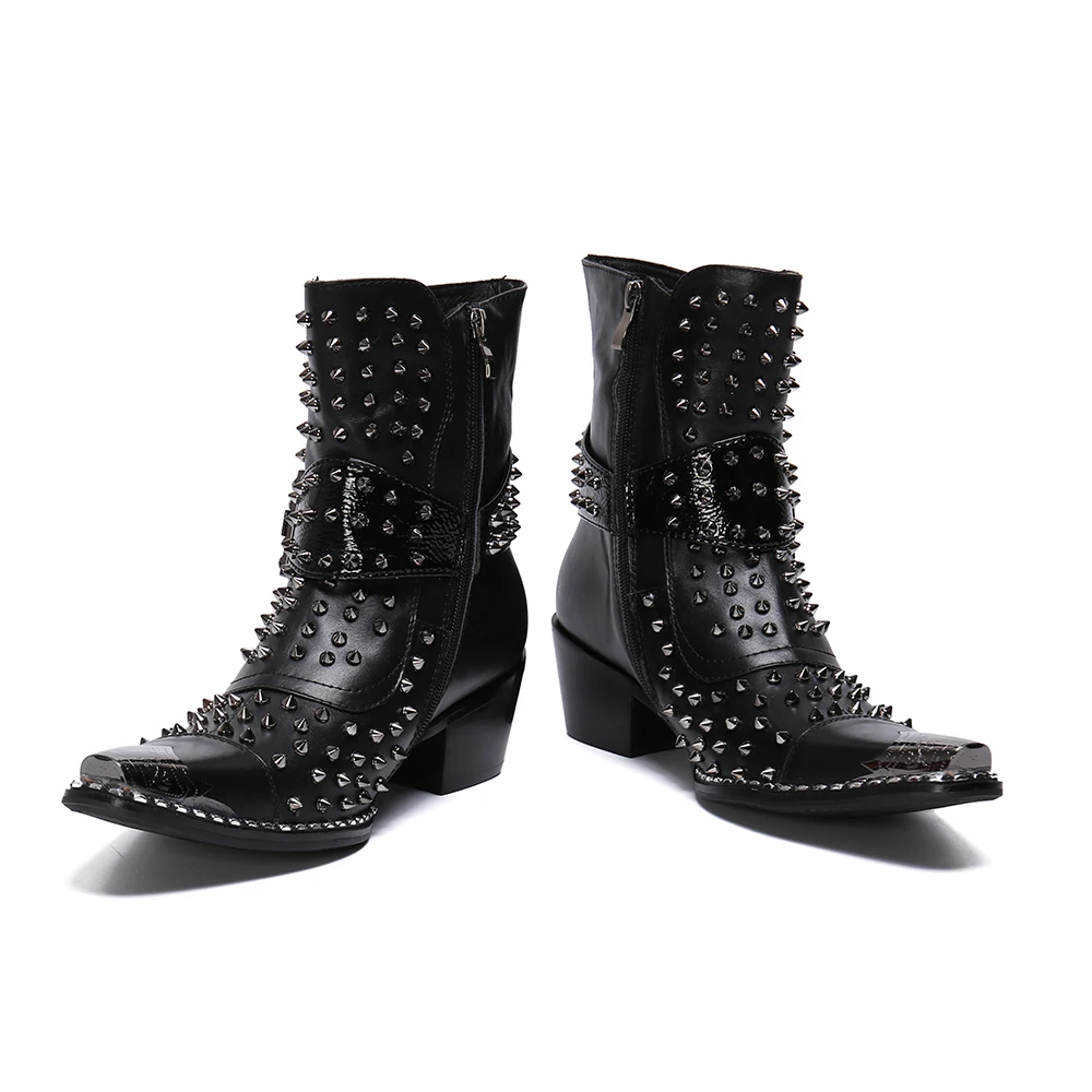 NA310 Fashion Party Men Genuine Leather Boots Rivets Chains Motorcycle Short Boots Metal Pointed Toe Cowboy Ankle Boots Winter