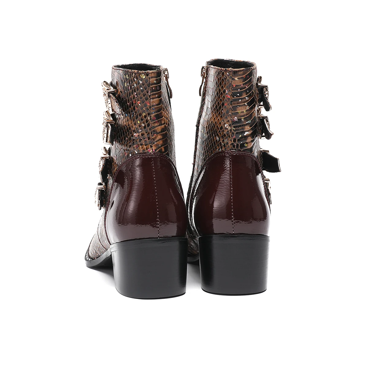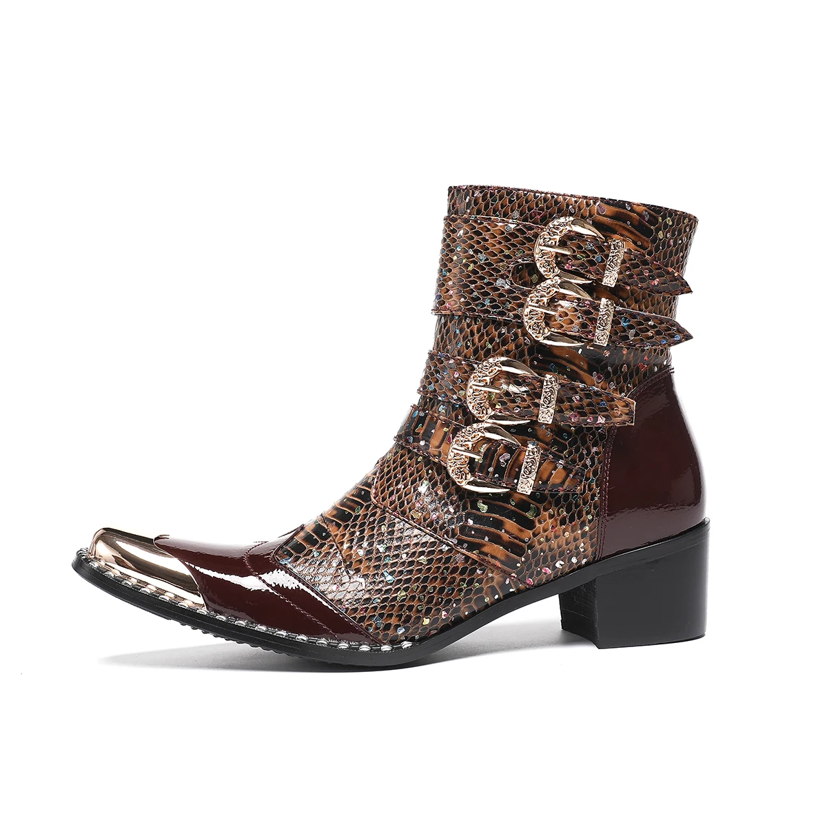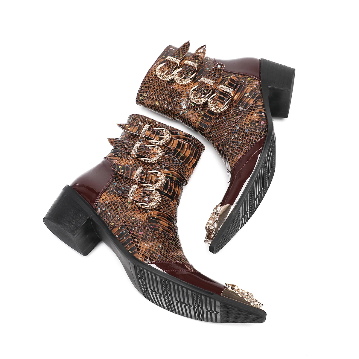 NA679 Punk Style Rivet Belt Buckle Decor Men Mid-Calf Boots Metal Pointed Toe Splicing Leather Shoes Male Motorcycle Boots