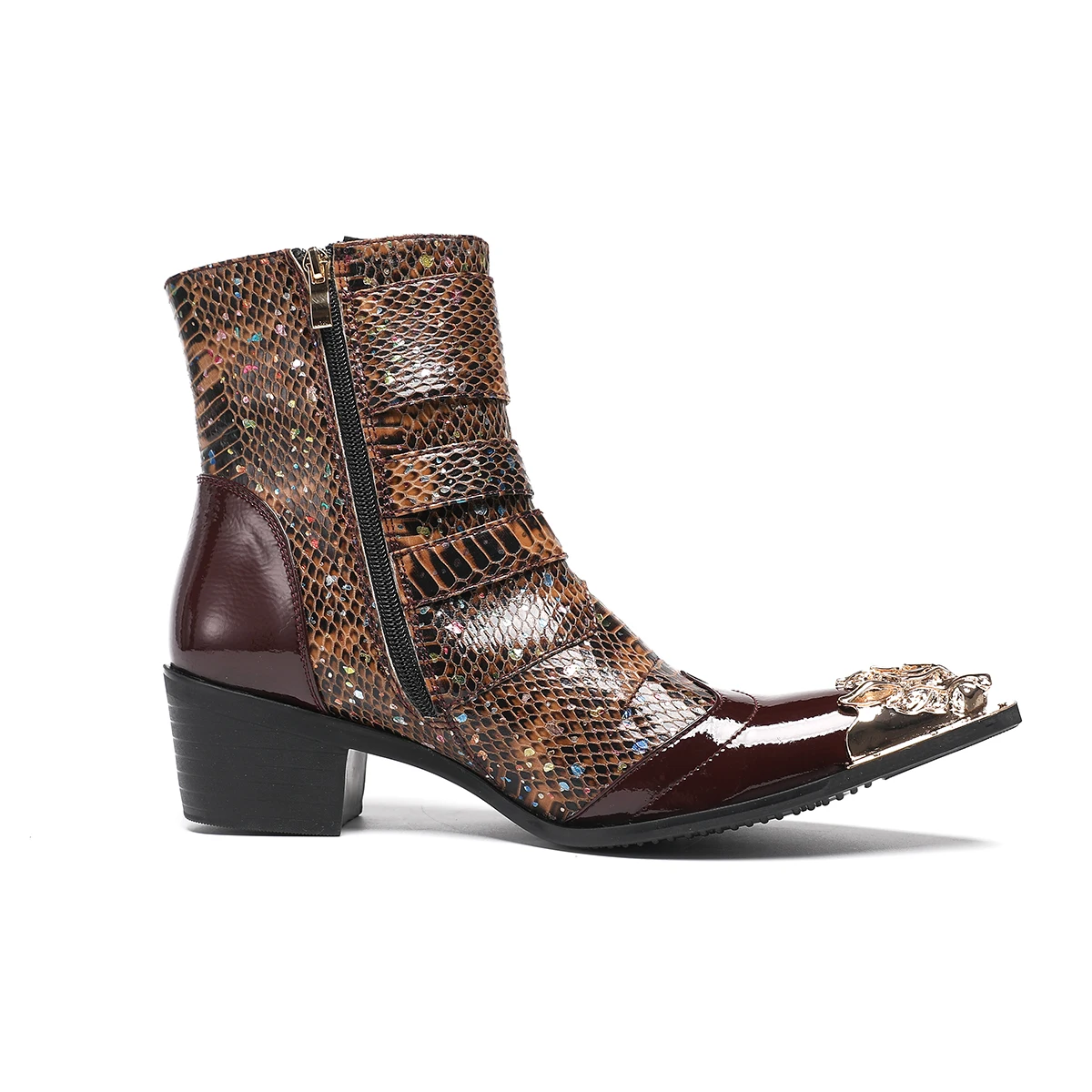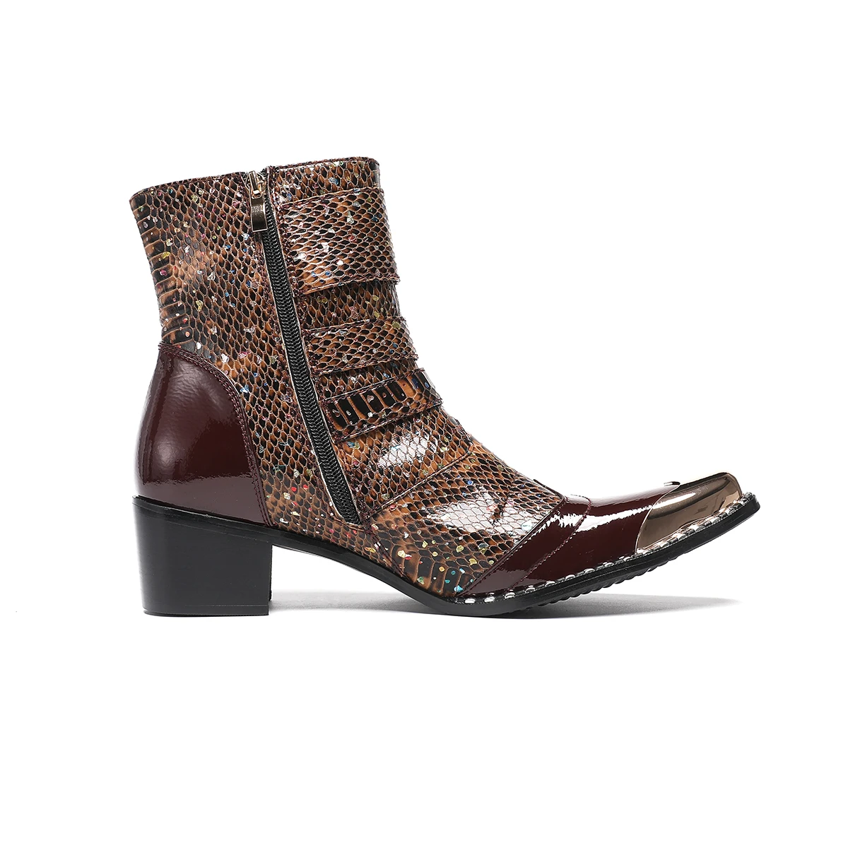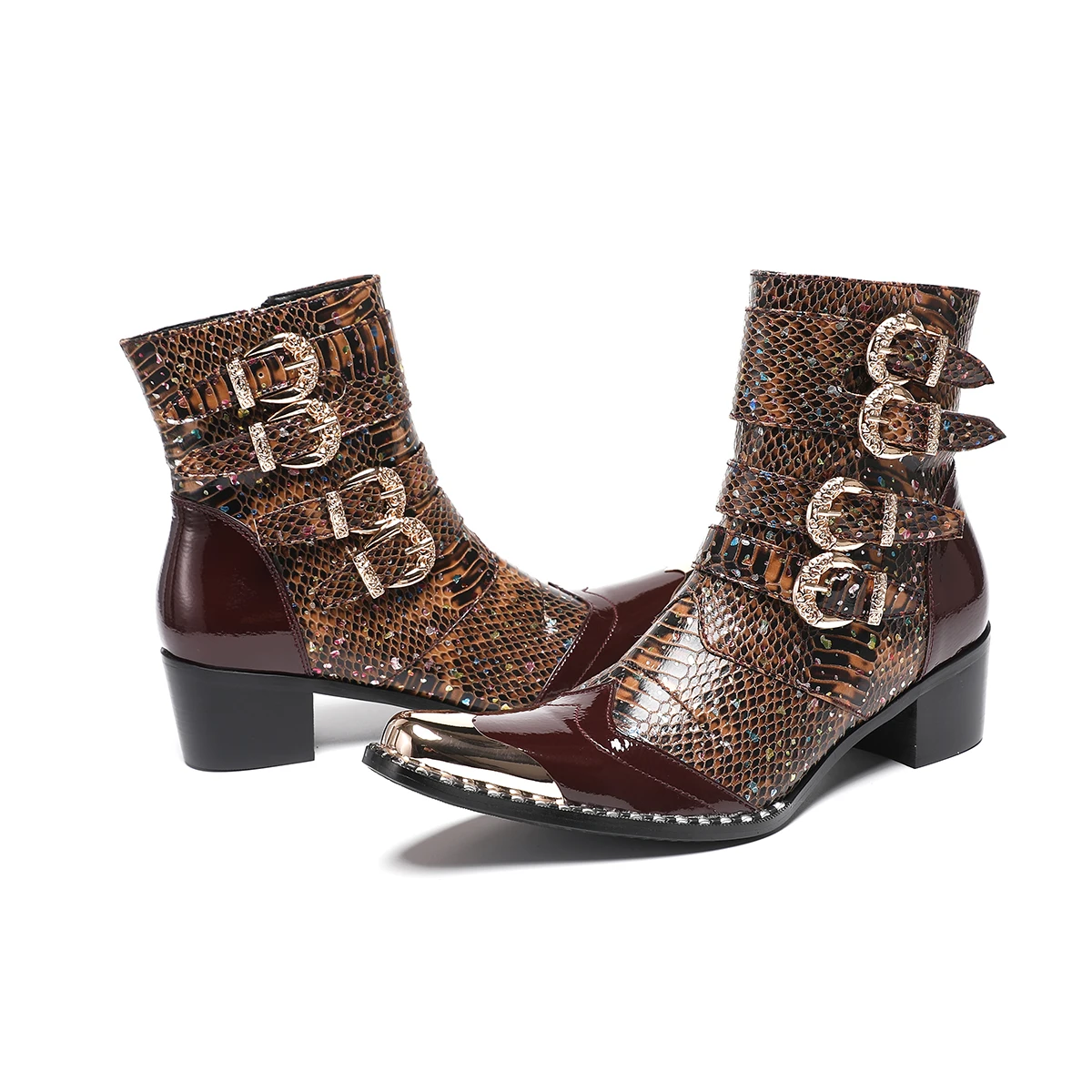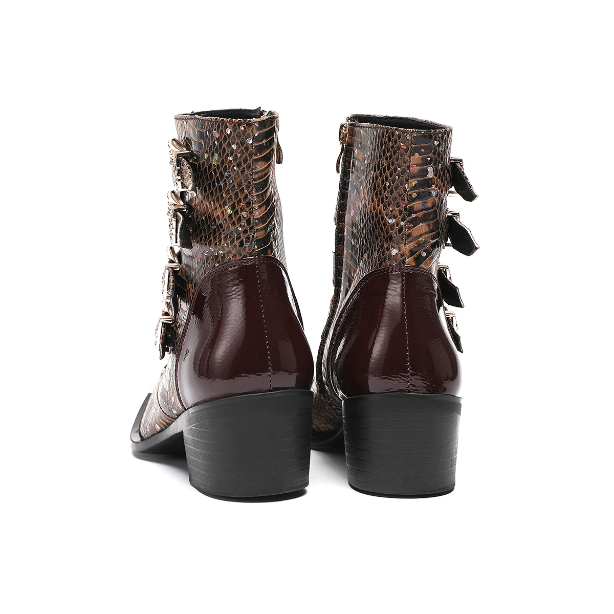 NA679 Punk Style Rivet Belt Buckle Decor Men Mid-Calf Boots Metal Pointed Toe Splicing Leather Shoes Male Motorcycle Boots