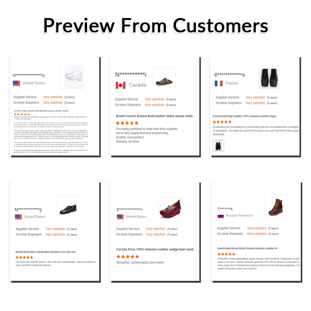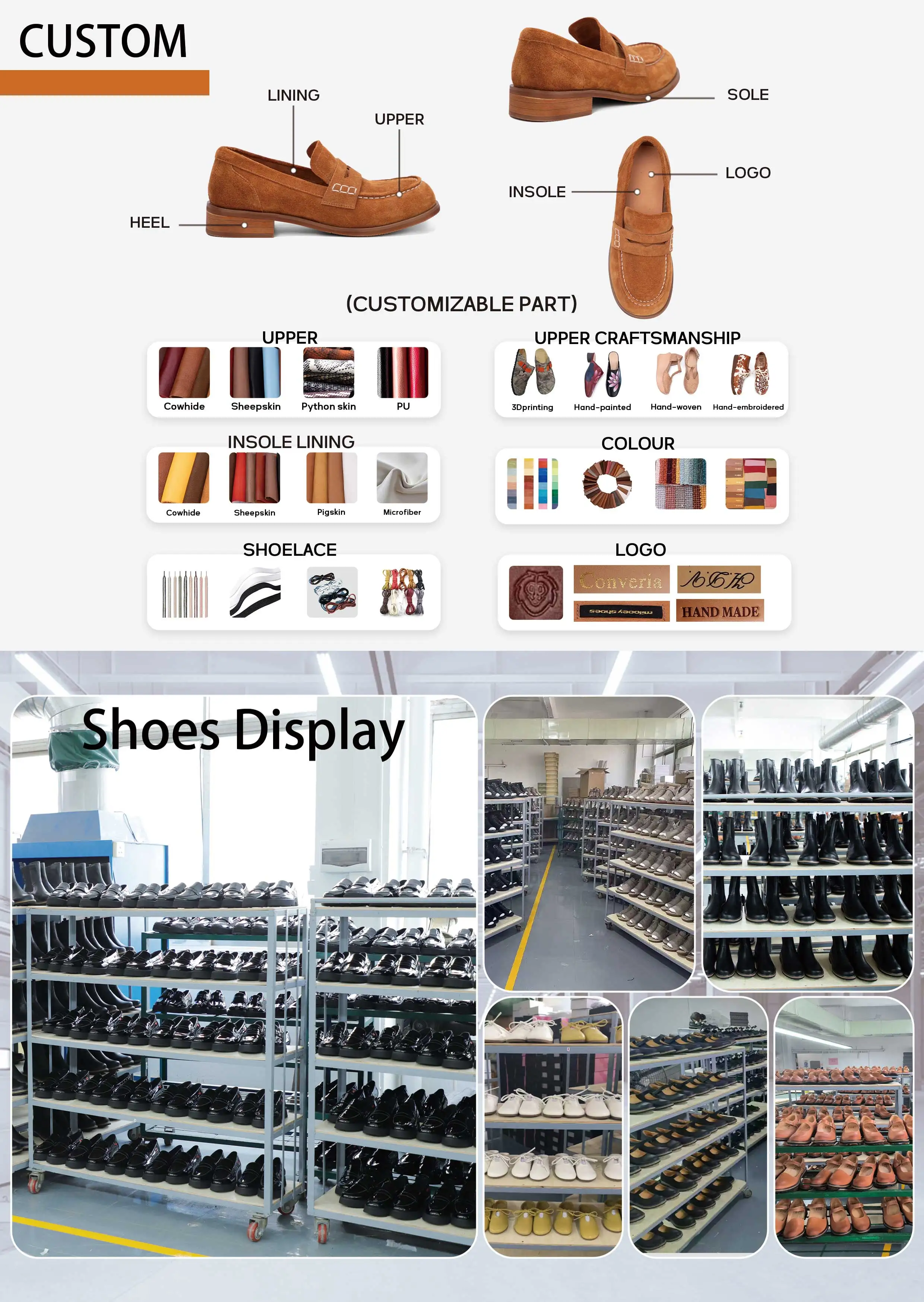 1.Whether you are a factory or a trading company? Yes, We are professional high quality genuine leather shoes manufacturer and exporter , founded in 2014. The factory is locates in Guangzhou. Guangzhou is the capital of handmade genuine leather shoes. 2.Can I check or visit your factory? Yes, Welcome to visit our factory, or by video call. 3.What is the delivery time? For in-stock ones it will be 1-3 workdays, and as to the custom shoes, it will be 5-7days after all the details be confirmed. 4.What size range you can provide? Our shoes size range is EU34-48 or US4-17,welcome to consult for customized plus size shoes. 5.How can we guarantee quality? (1).Always a pre-production sample before mass production; (2).Always final Inspection before shipment; (3).Our factory has professional QC team. 6.Why should you buy from your factory not from other suppliers? We have our own shoe factories, with genuine leather materials are imported raw materials, in the price, we have competitive advantage. Our shoes are all by hand-made, and each pair is of great quality and texture.Every pair of shoes is unique. 7.What services can your factory provide? (1).Accepted Delivery Terms: FOB,CFR,CIF,EXW,Express Delivery;(2).Accepted Payment Currency:USD,EUR,HKD,CNY;(3).Accepted Payment Type: T/T,L/C,MoneyGram,Credit Card,PayPal,Western Union,Cash,Escrow.