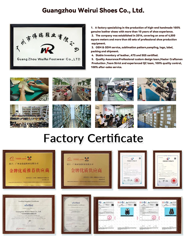 Guangzhou Weirui Shoes Co., Ltd. founded in 2014,is a professional research and development, production, sales as one of the leather shoes enterprises. Our factory provides OEM ODM High-end 100% genuine leather shoes services. 4500 square meters of area, More than 60 professional productionequipment,Monthly output is more than 60,000 pairs,Excellent design and development team,More than 150 skilled and well trained workers,Strict and professional QC team, 100% quality assurance, 100% after-sales service.Our factory has ATS and SGS certification,Leather quality inspection report, brand appearance patent.