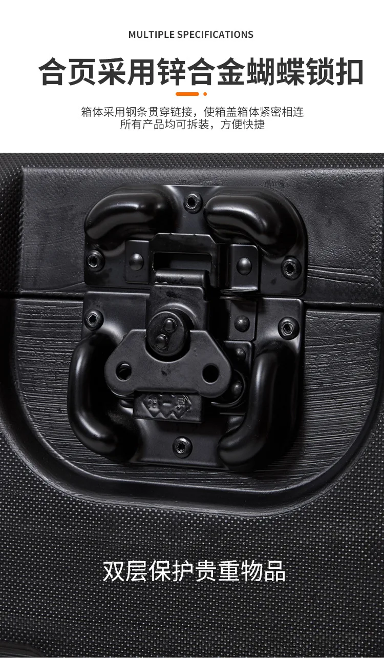 | Hinge adopts zinc alloy butterfly lock.The box body is linked by steel bars, so that the box body of the box cover is closely connected.All products can be disassembled and assembled, which is convenient and quick. |