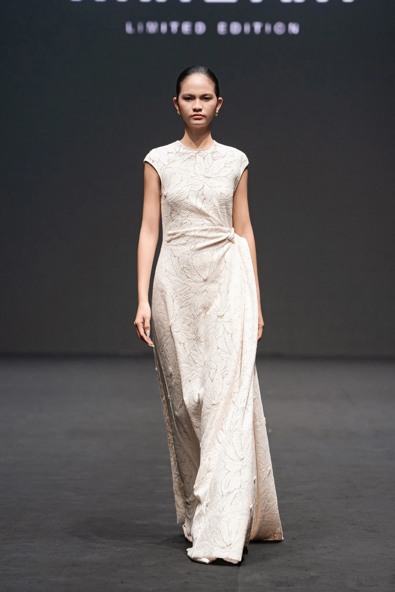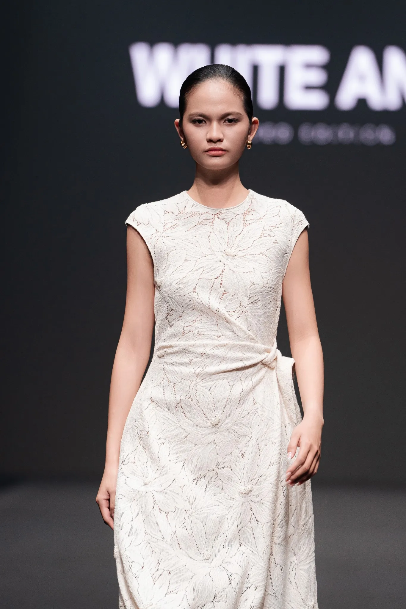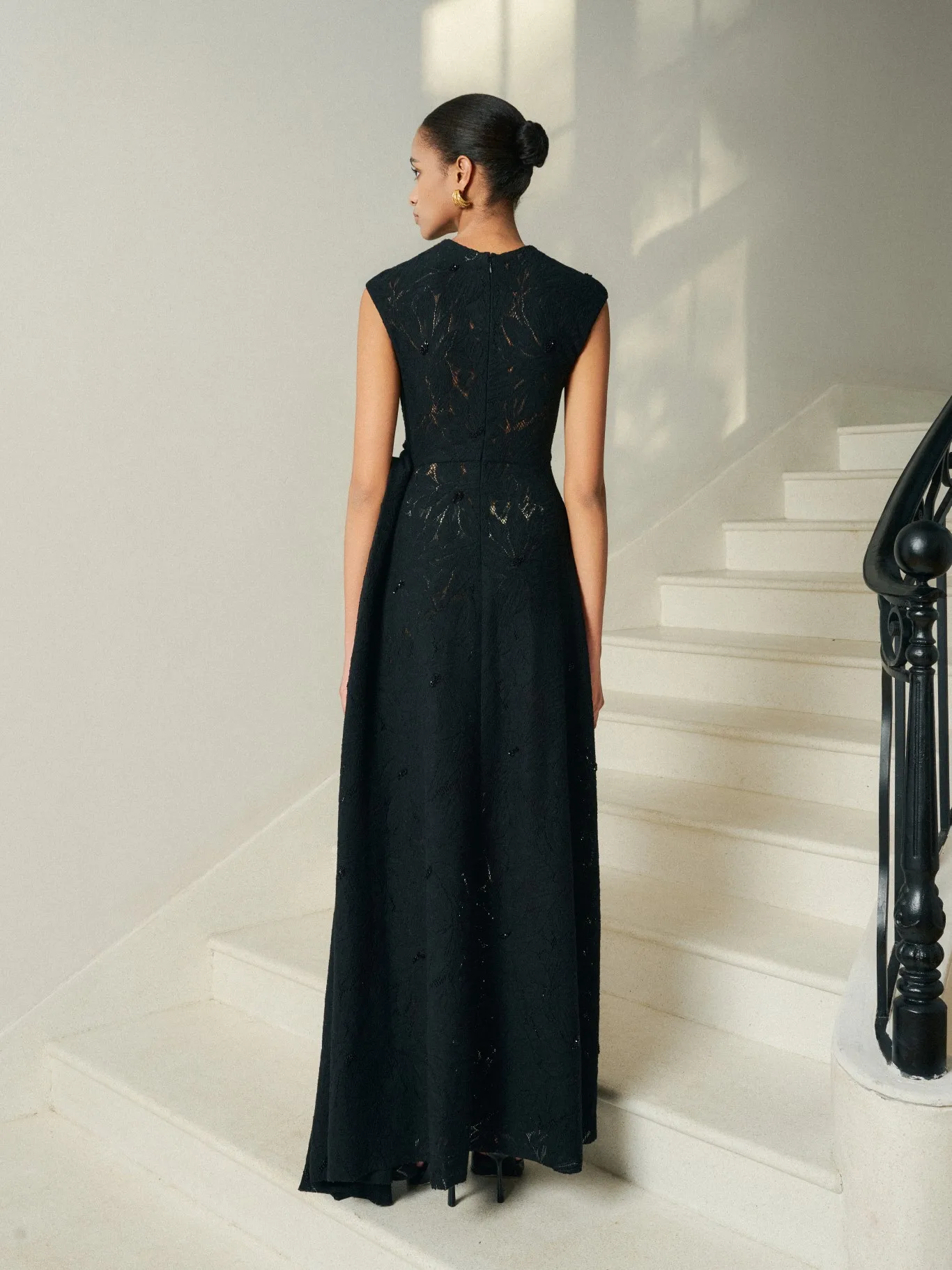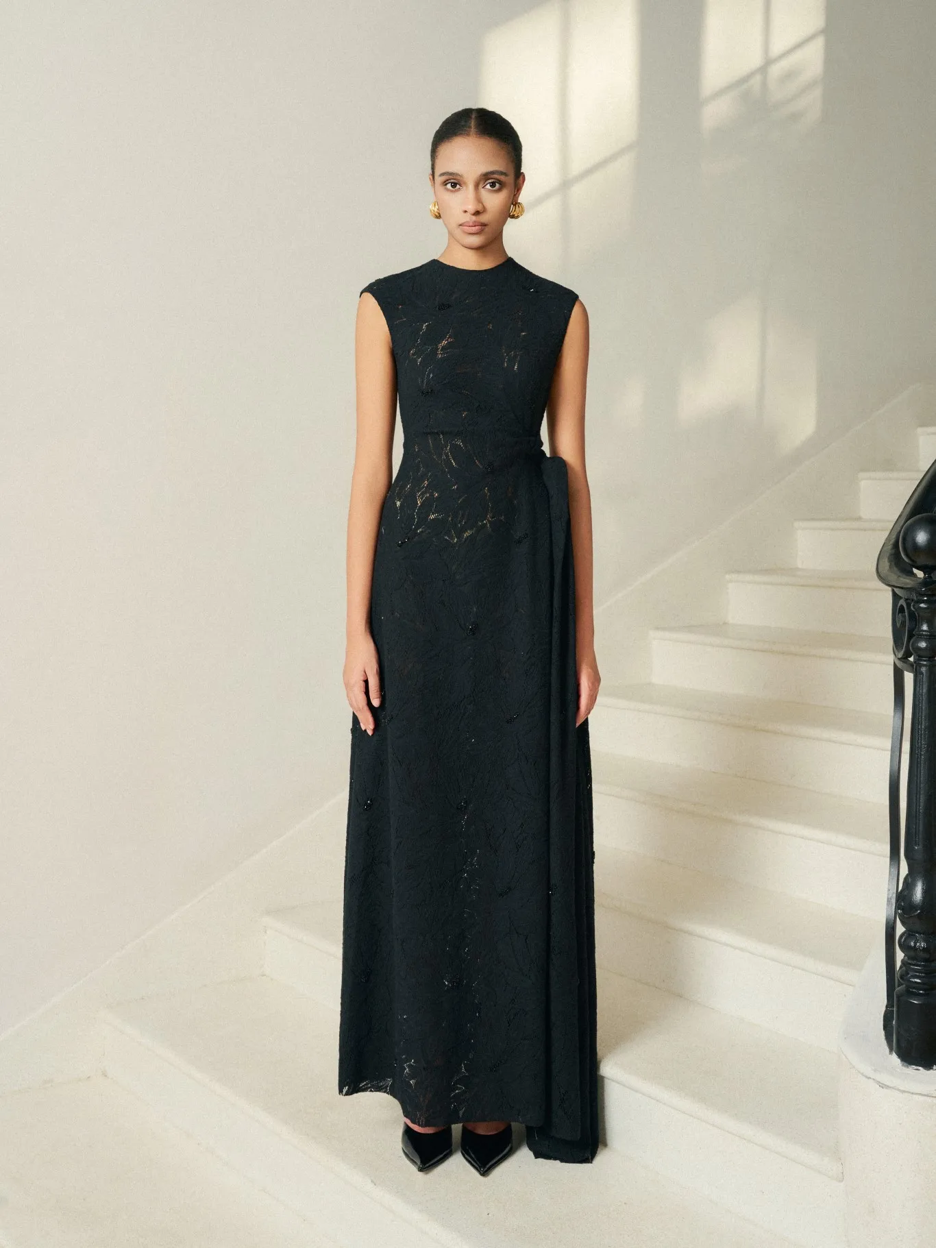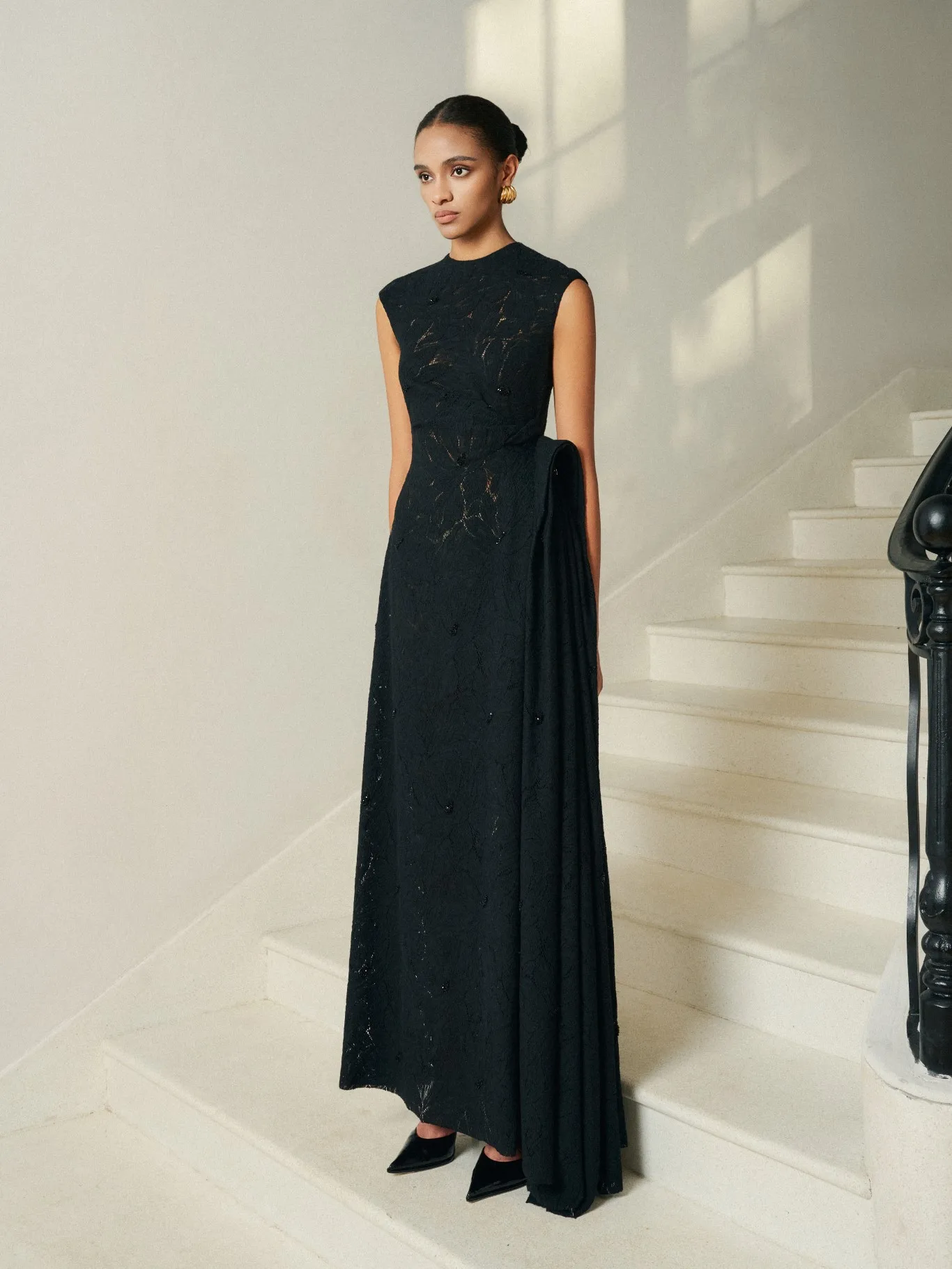Sleeveless floral lace midi dress, round neck, side drape, hand-sewn on fabric background.