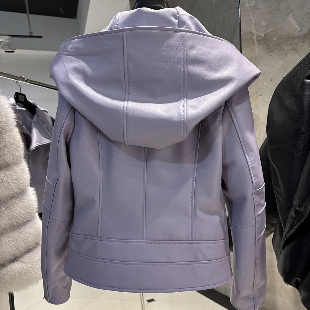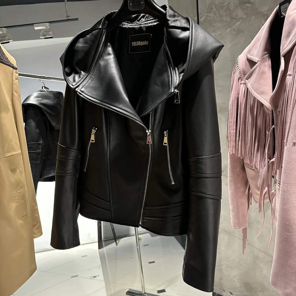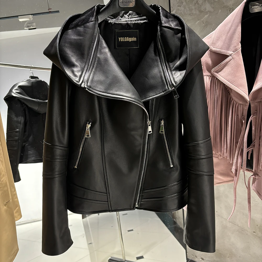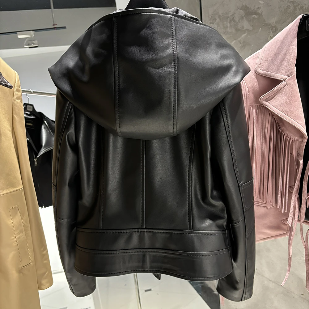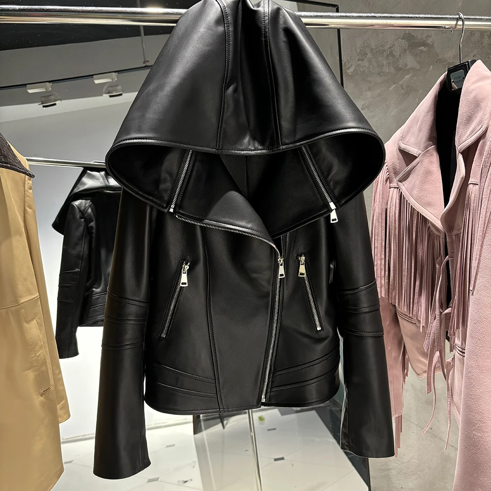 2025 Spring Black Leather Coat Biker Slim Leather Clothes Real Sheepskin Leather Jacket With Hood