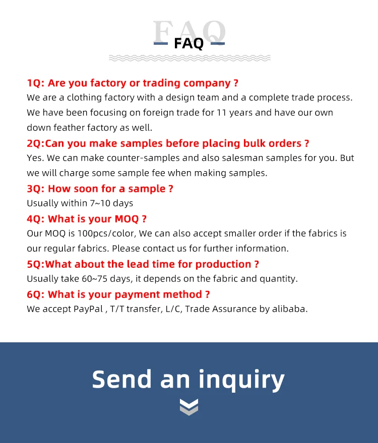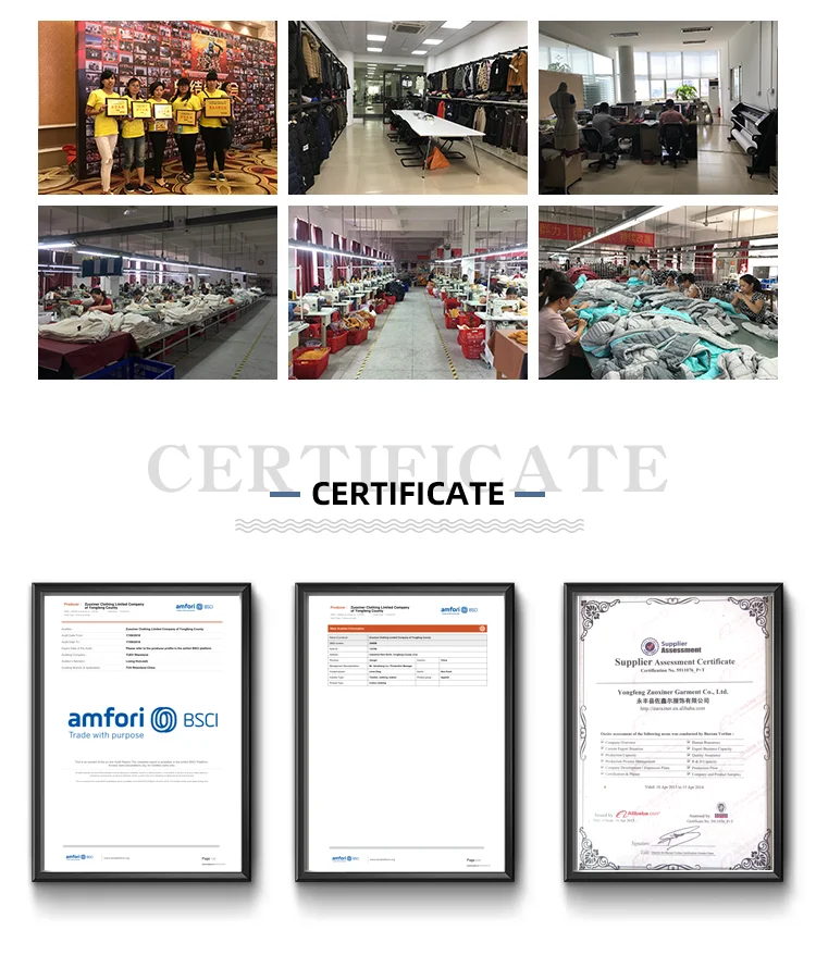 We were established in 2007 as a comprehensive manufacturing and trading company located industry area in Yongfeng, Jiangxi Province and have about 200 employees. Our production area is about 10,000 square meters. We have been engaged in ladies' jacket collection for 8 years and are specialized in producing PU leather jackets (garment washed).