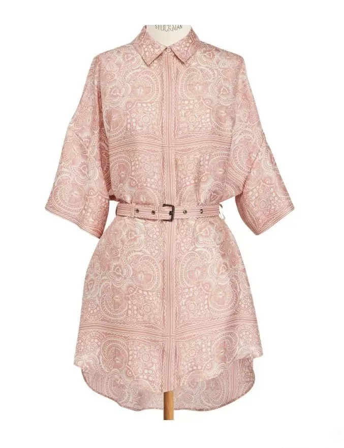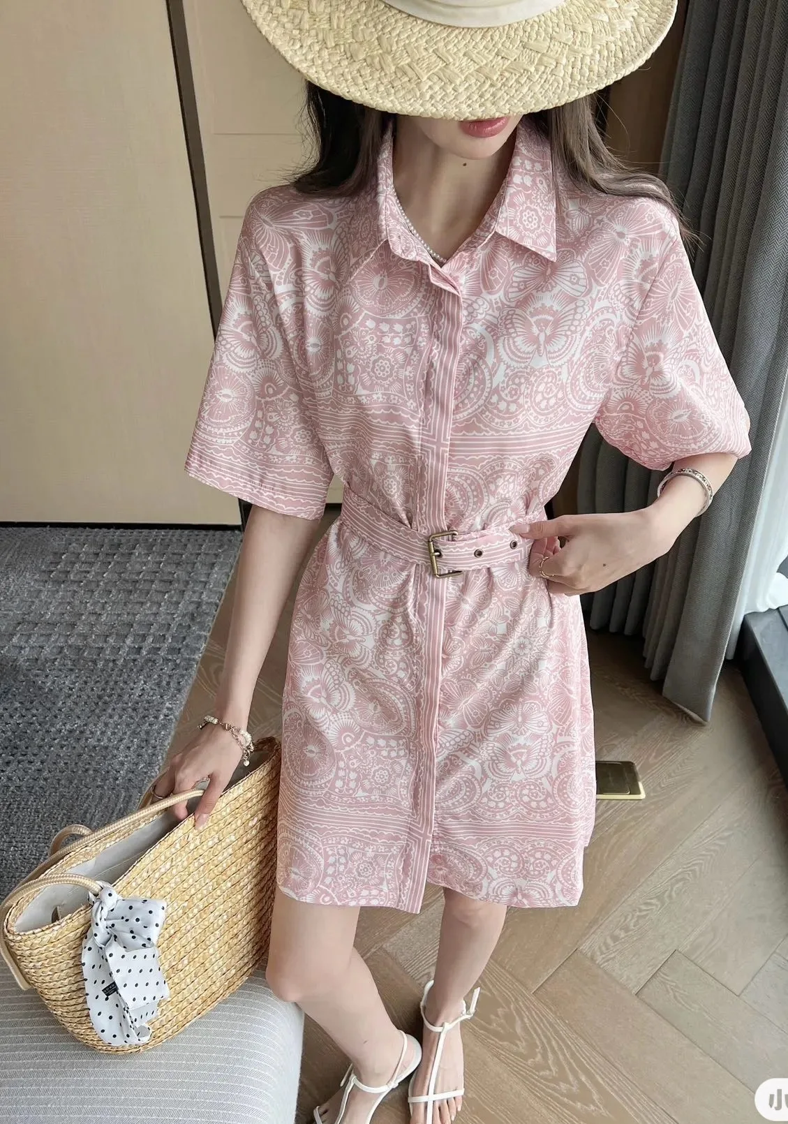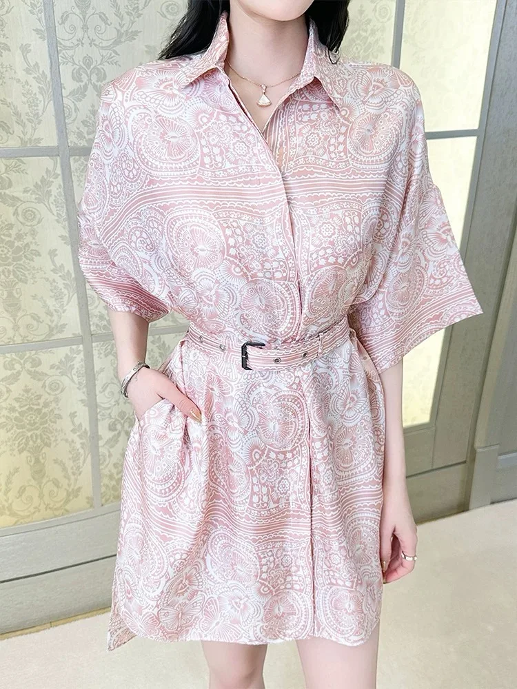 2025 Women's One-piece Paisley Butterfly Pattern Dress 100% Heavy-weight Silk Elegant Short Sleeve with Belt for Ladies