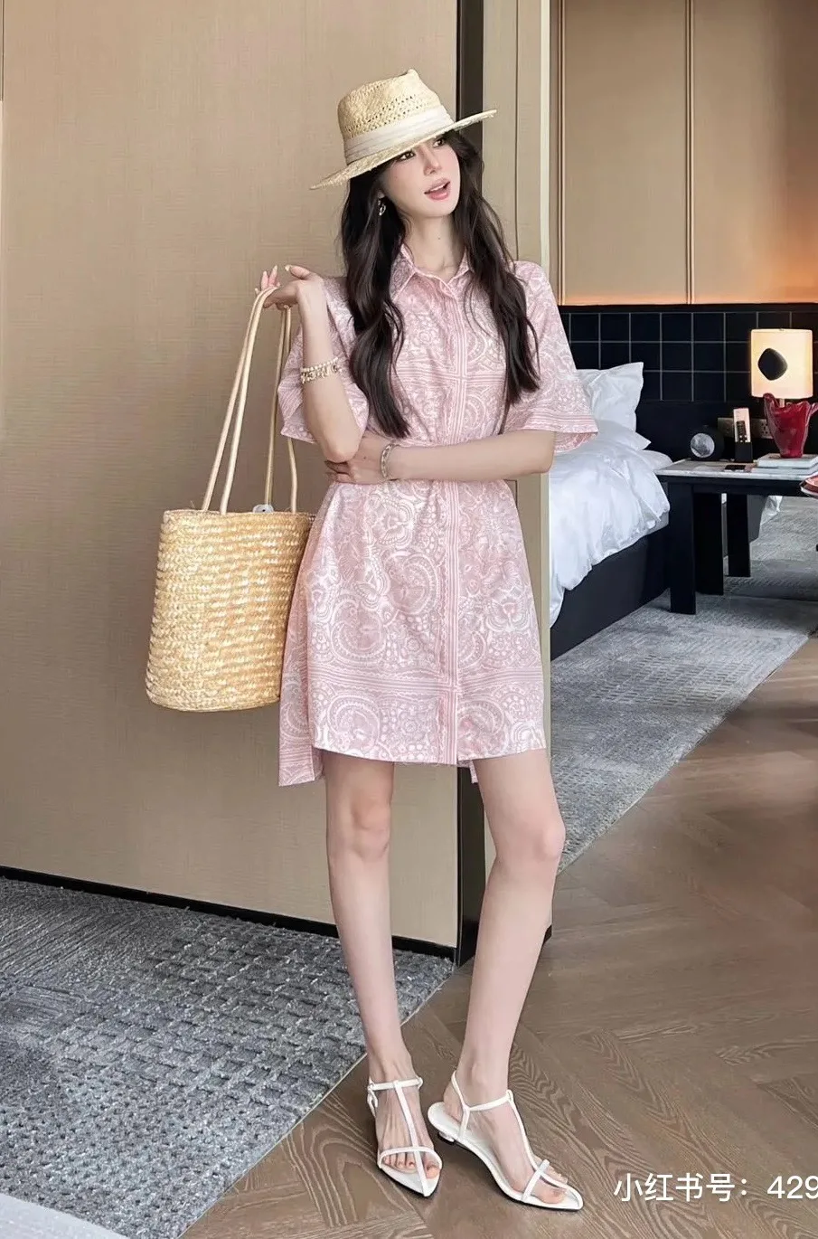 Dynamic Tailoring: Shirt-dress structure paired with mid-length puffed sleeves, A-line skirt flows gracefully. Adjustable