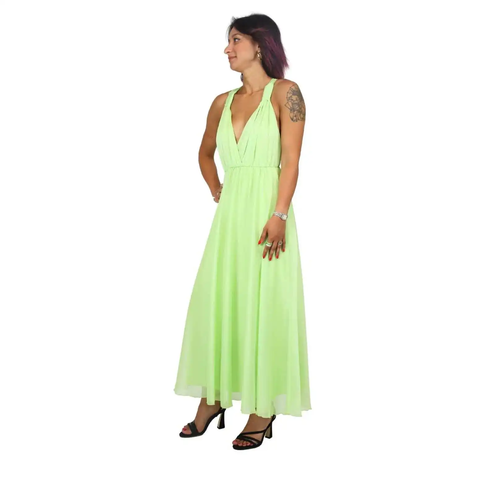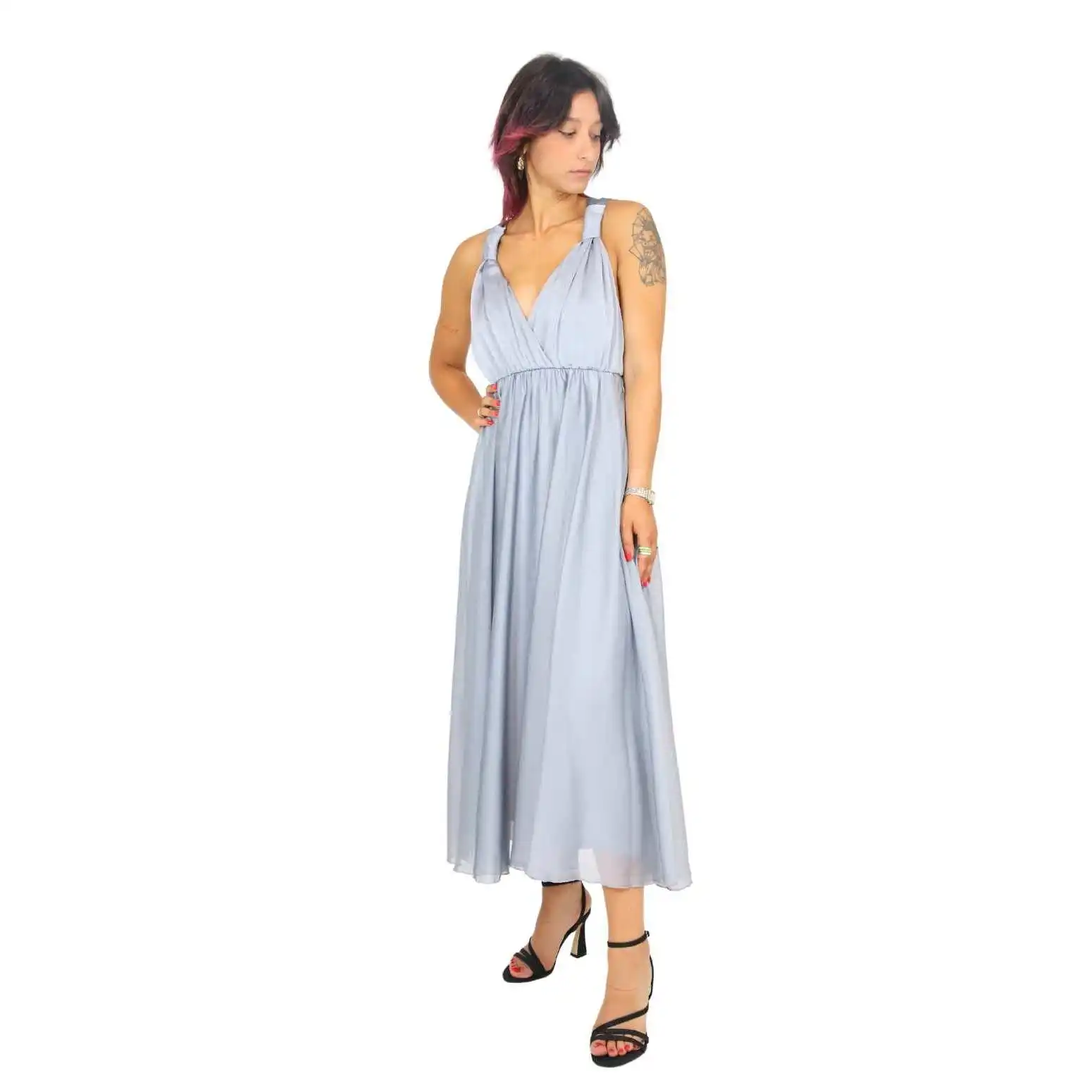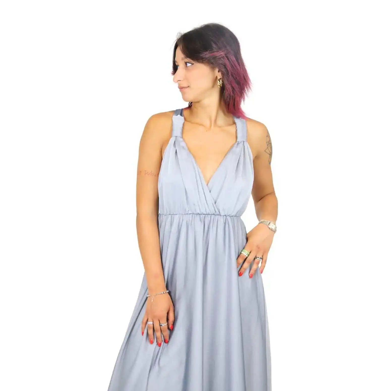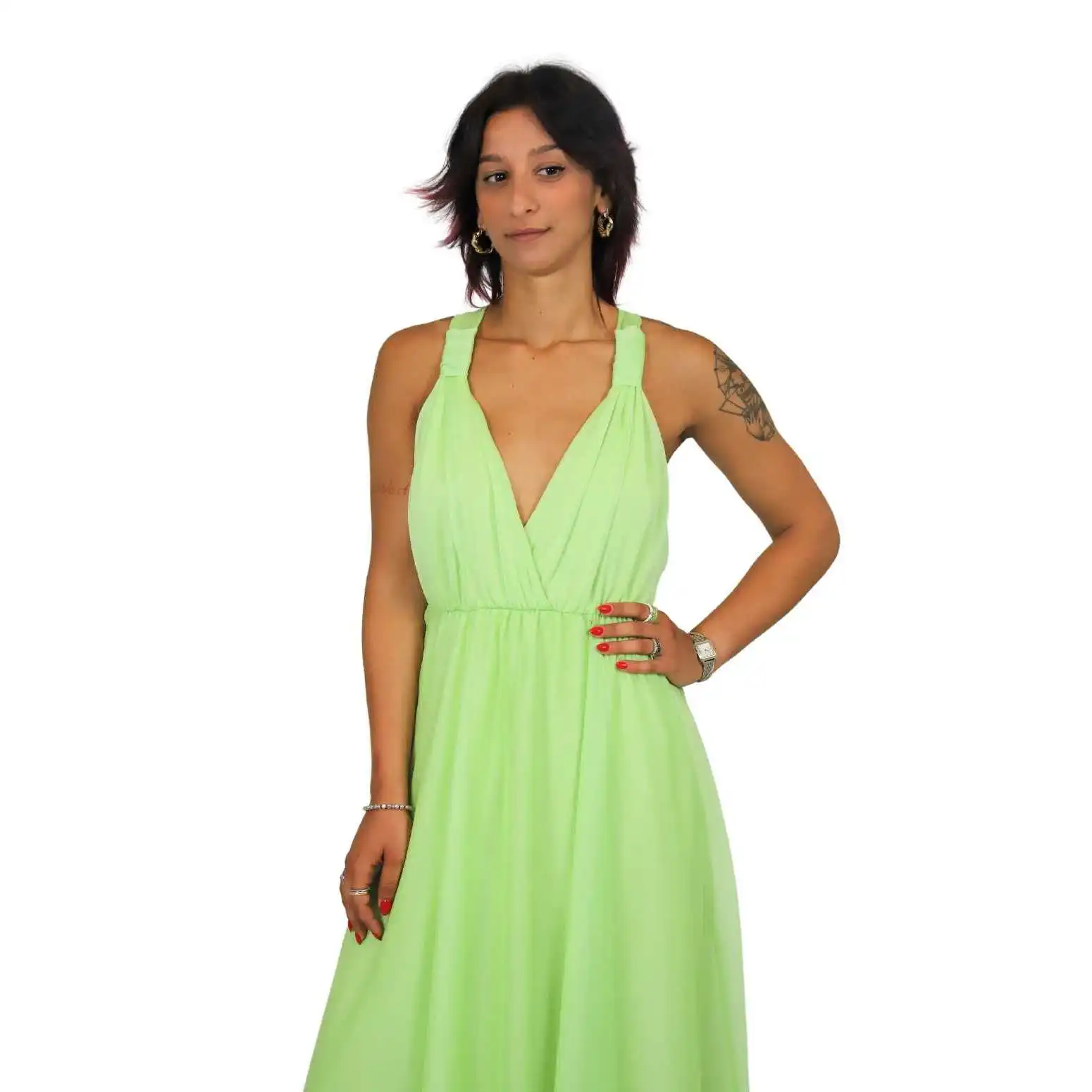 This dress is available in sizes S and M, catering to different body types. It comes in two colors: VERDE (green) and GRIGIO (grey), allowing you to choose based on your preference or the occasion. The dress boasts a V-neckline and sleeveless design, providing a chic and versatile look.