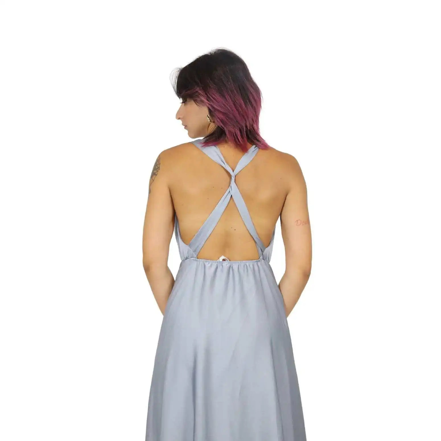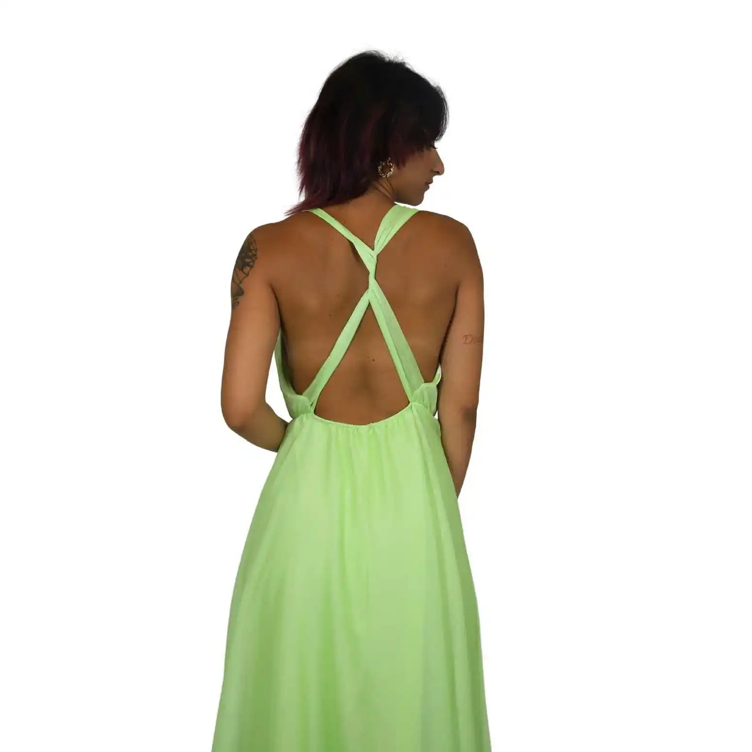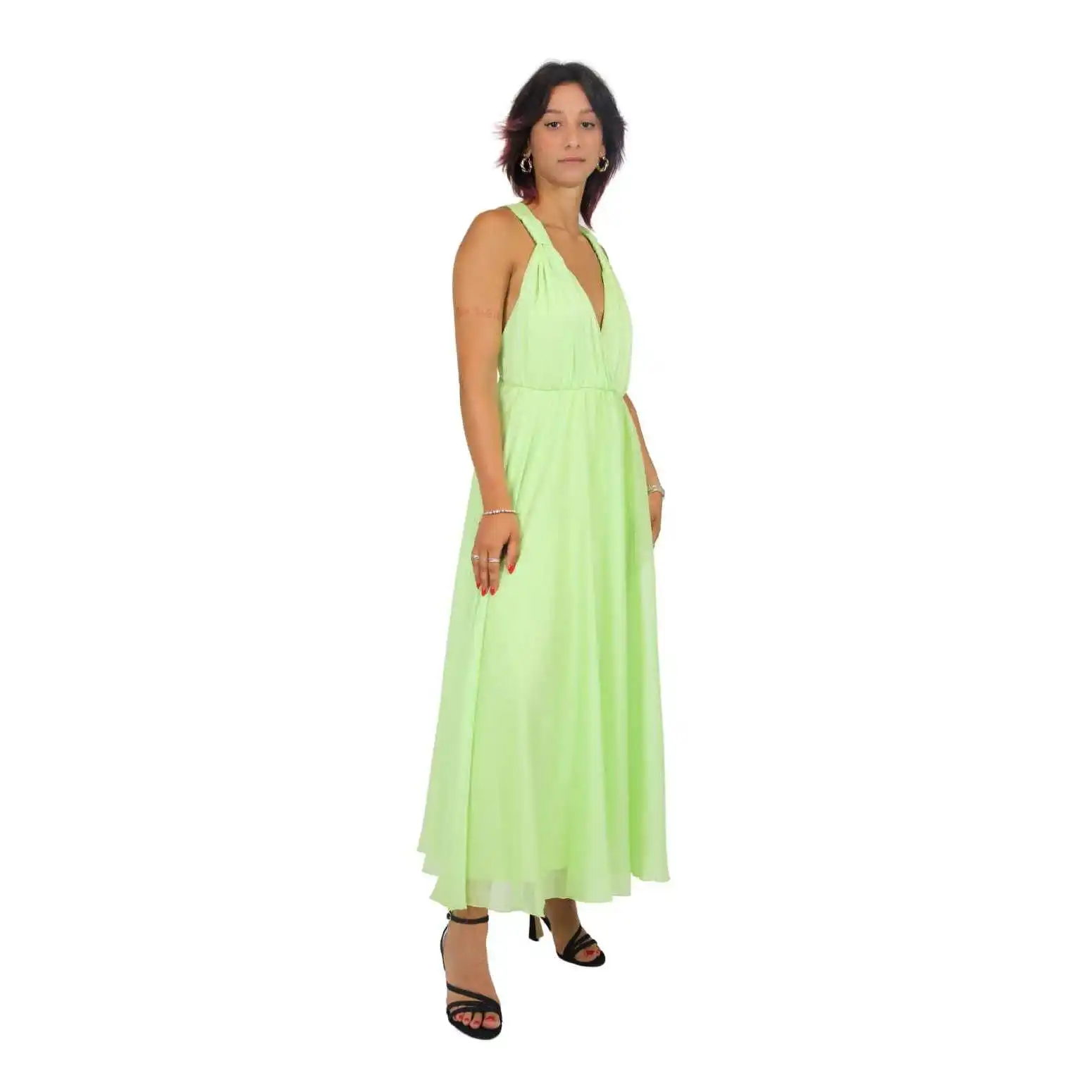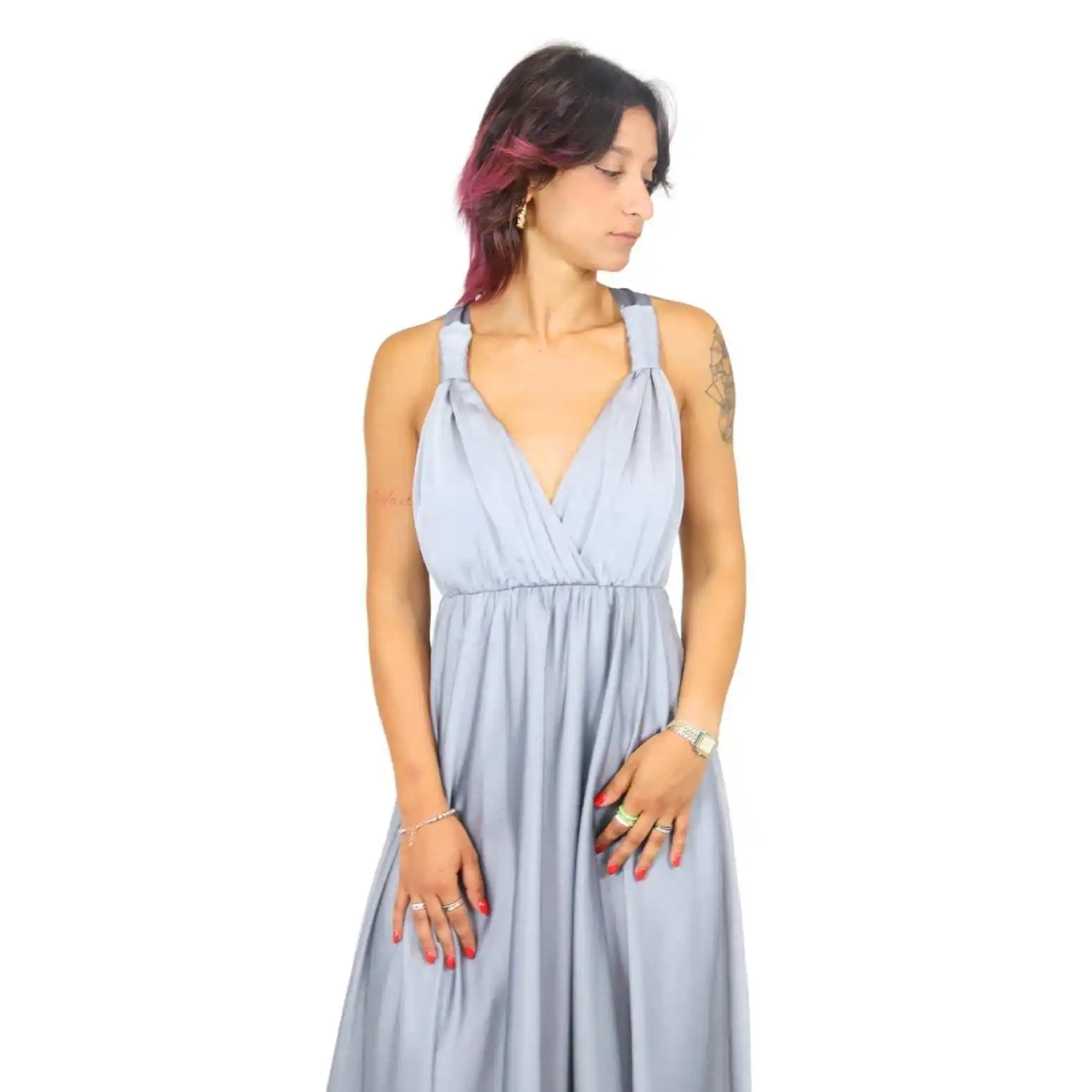 This dress is available in sizes S and M, catering to different body types. It comes in two colors: VERDE (green) and GRIGIO (grey), allowing you to choose based on your preference or the occasion. The dress boasts a V-neckline and sleeveless design, providing a chic and versatile look.