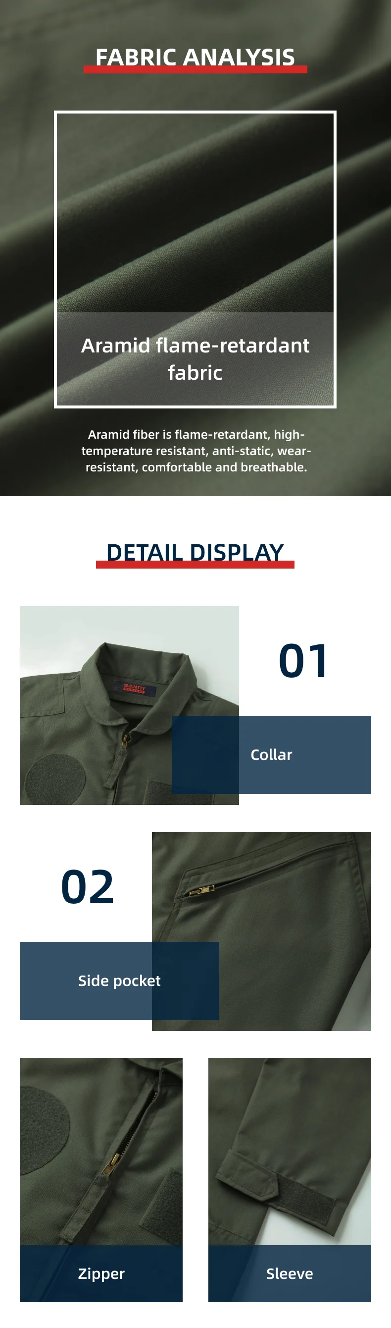 Fabric characteristics | Aramid is flame-retardant, high temperature-resistant, anti-static, wear-resistant, comfortable and breathable. | ||