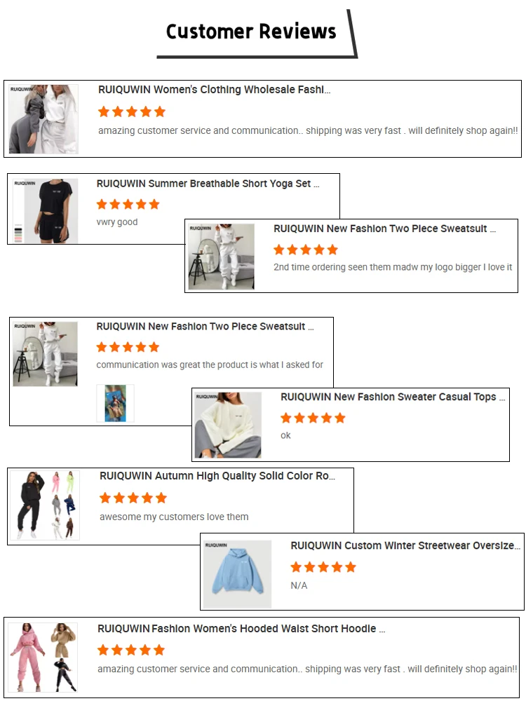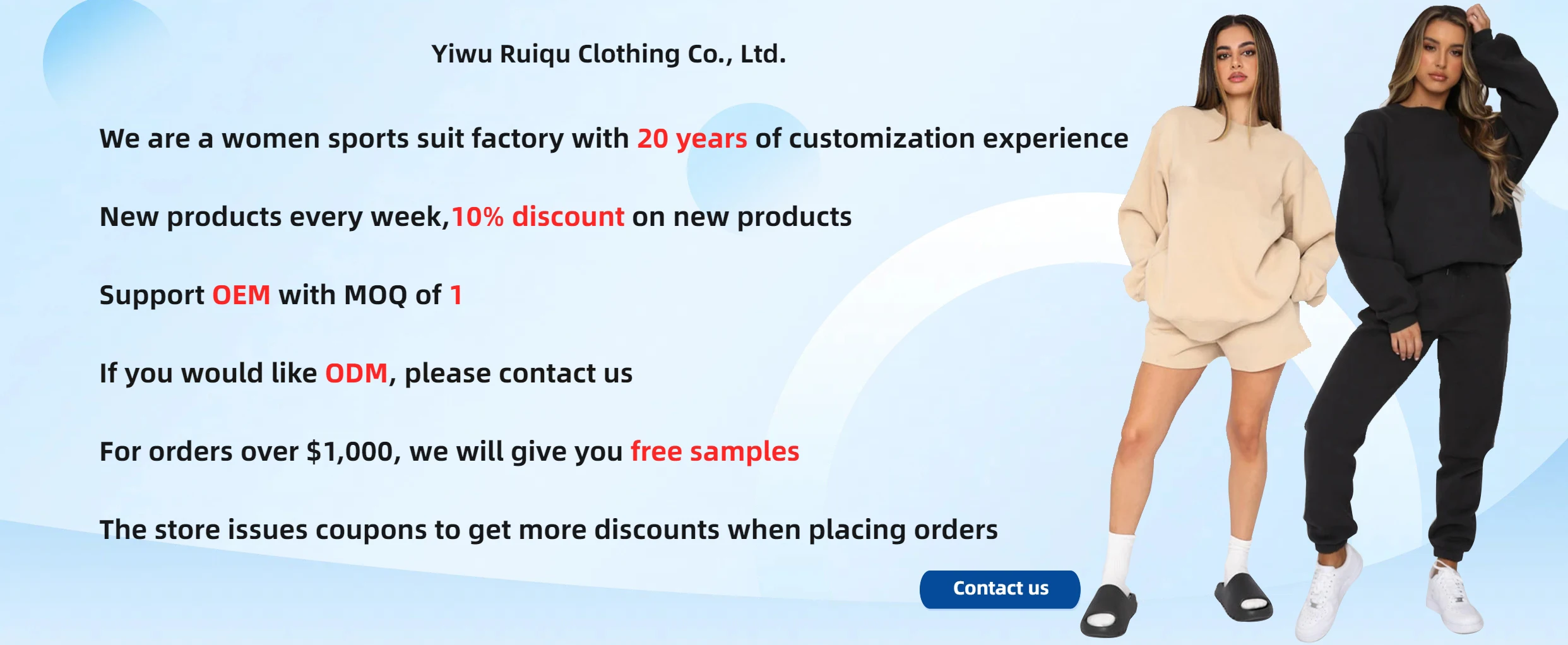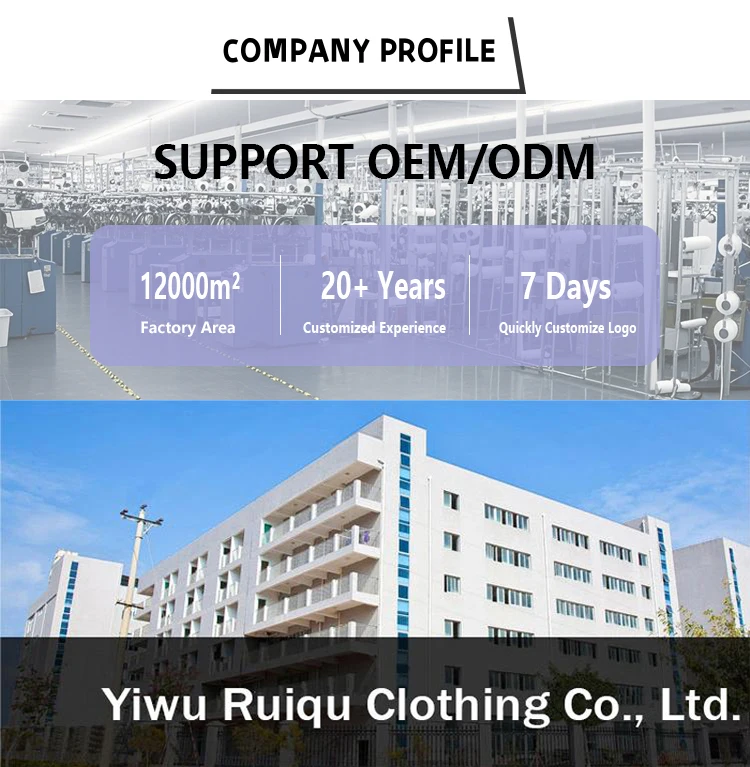 Yiwu Ruiqu Clothing Co., Ltd. is located Yiwu City in China. The Company is a leading internation manufacturer & supplier of Women Sportwear more than 20 years. Accept ODM custom and OEM Service. No MOQ.Our factory not only uses advanced sewing machines and professional processes to produce,but also employs experienced workers .Our factory can make more than 2000 pcs products one Day. Our company supply sport products in more than 65 countries to over 4500 reliable retailers.Company values:Respect for customers, Integrity, Team first!Company vision:Create the most popular sports brand products in world!Company business philosophy:honesty, cooperation, win-win situation, development!Company status: Inspirational, Healthy, Optimistic, Tolerant, Sharing, Unity, Gratitude!Company mission: Create value for customers, Realize dreams for employees, Prosper for the motherland, and make unremitting efforts for the happiness of themselves and their families!