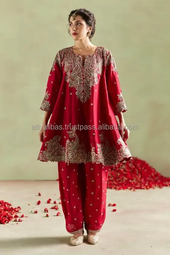 stunning embroidery work on short anarkali top & plzao pant dress with crystal glass beads,stone,dabka work for party-wear@2024