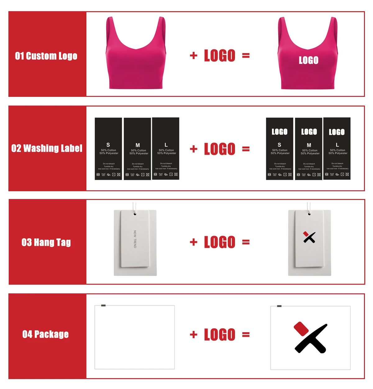 | Logo | Heat Transfer, Screen print, Embroidery, Silicone print, Sew Tag etc. |