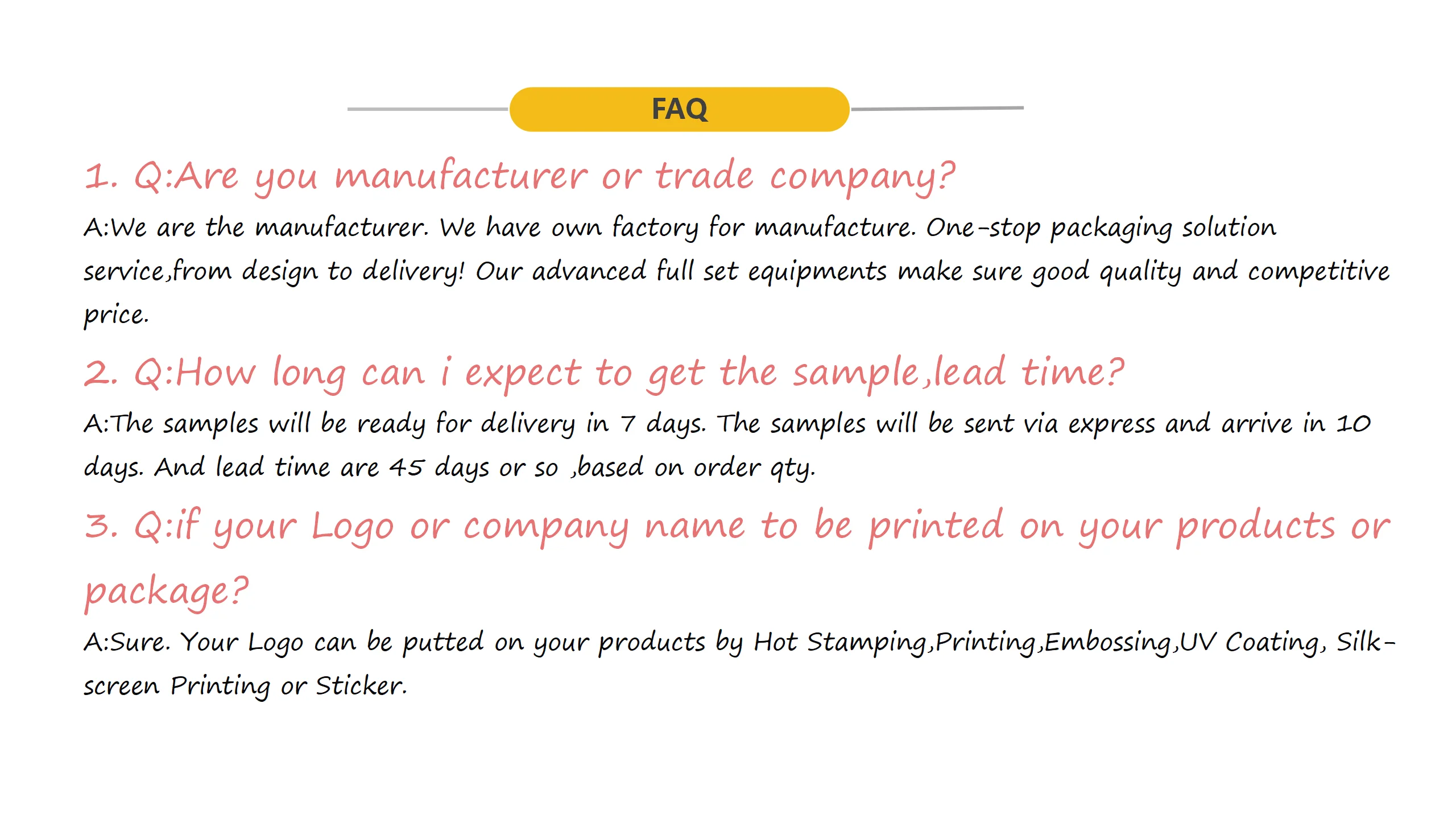 A:We are the manufacturer. We have own factory for manufacture. One-stop packaging solution service,from design to delivery! Our advanced full set equipments make sure good quality and competitive price.
