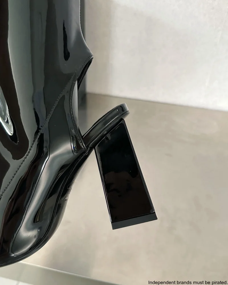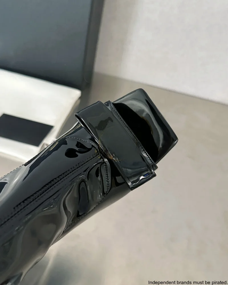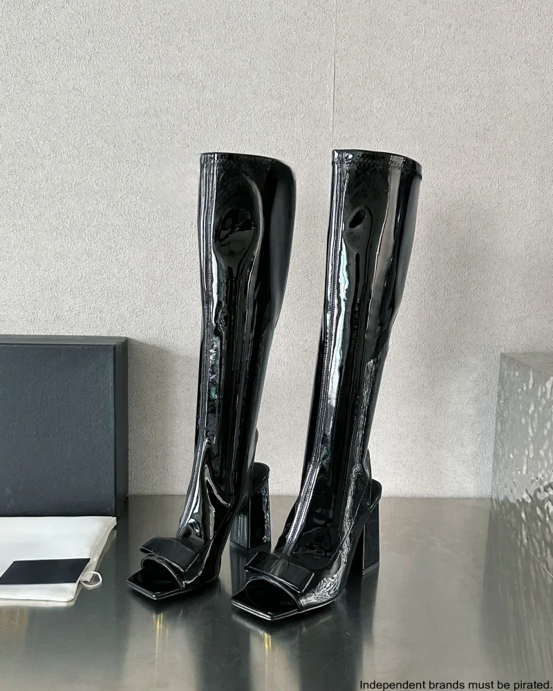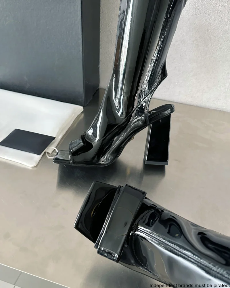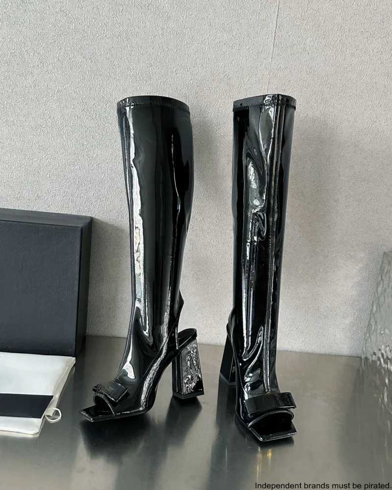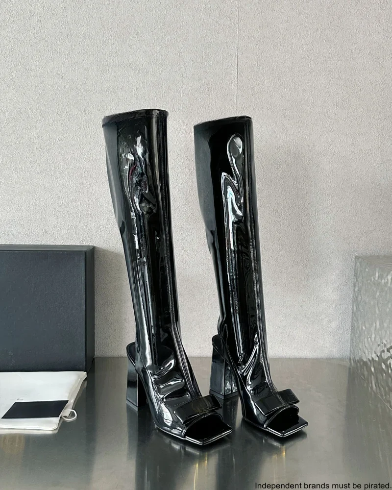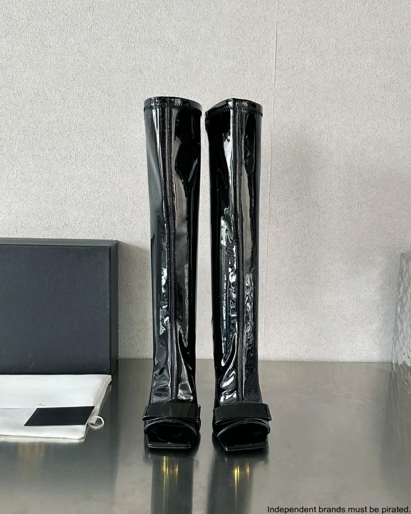 Leather knee-high boots set on patent high-block heels. The pair features the 'nastro Gianni' bow and M signifier, an