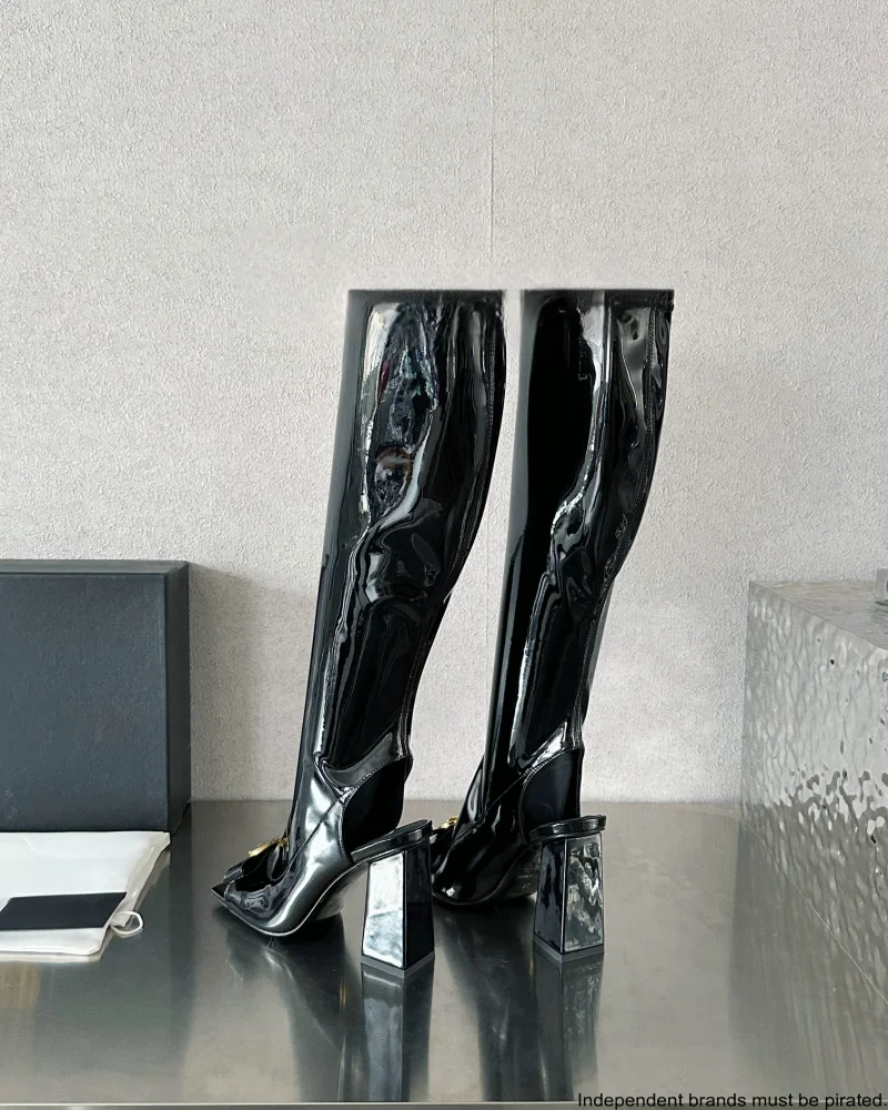 Leather knee-high boots set on patent high-block heels. The pair features the 'nastro Gianni' bow and M signifier, an