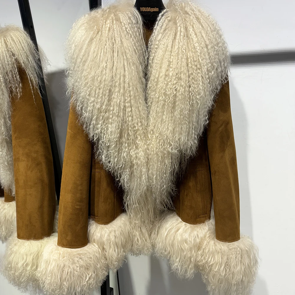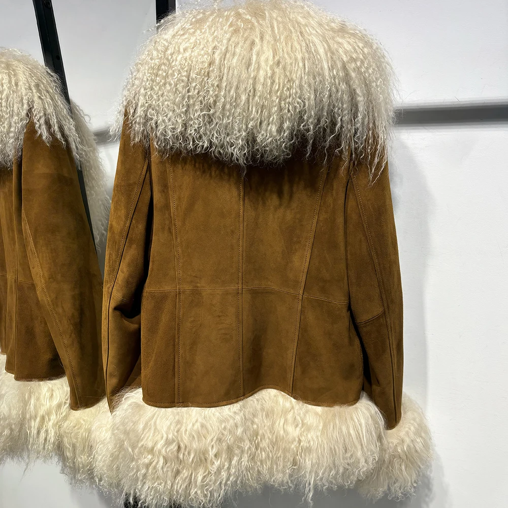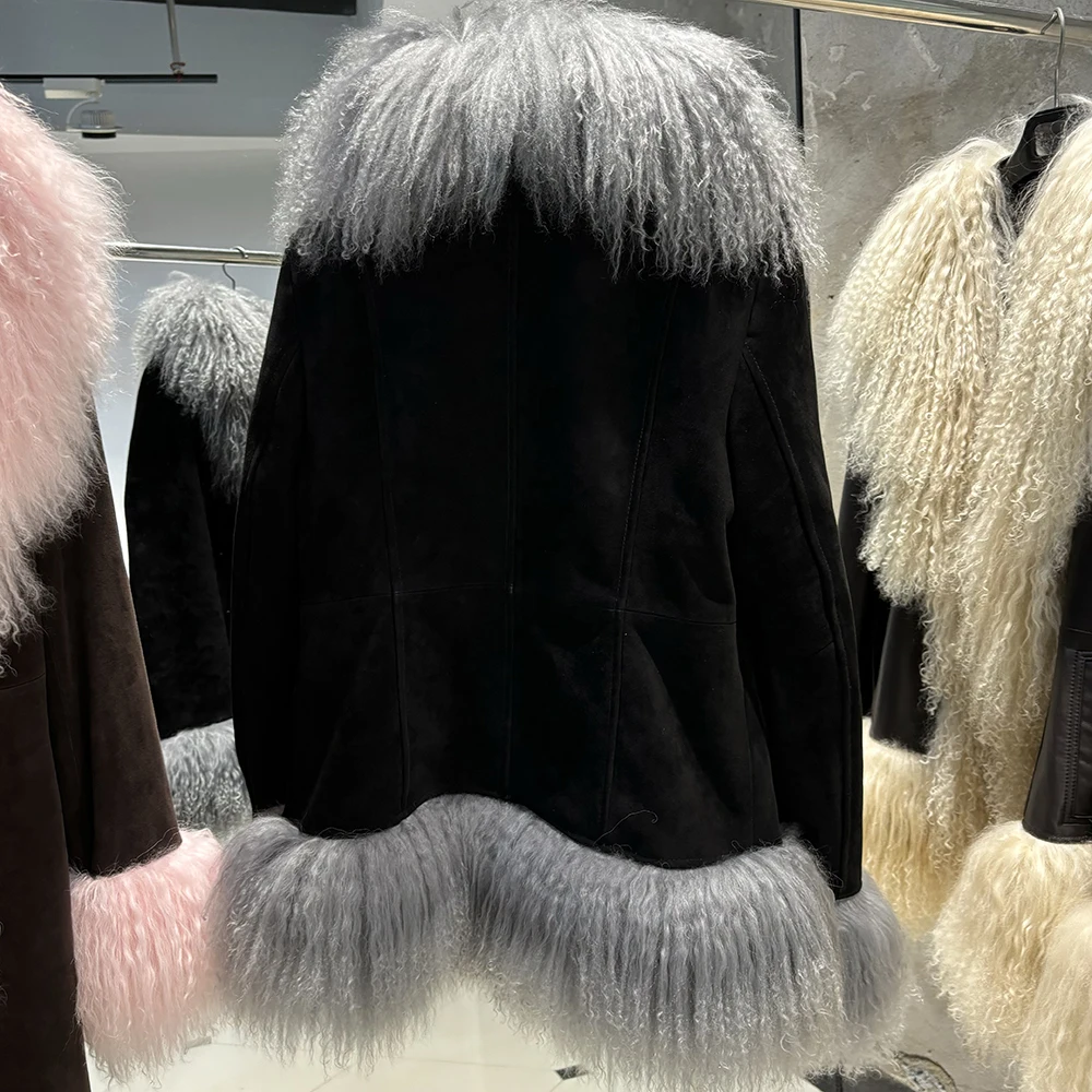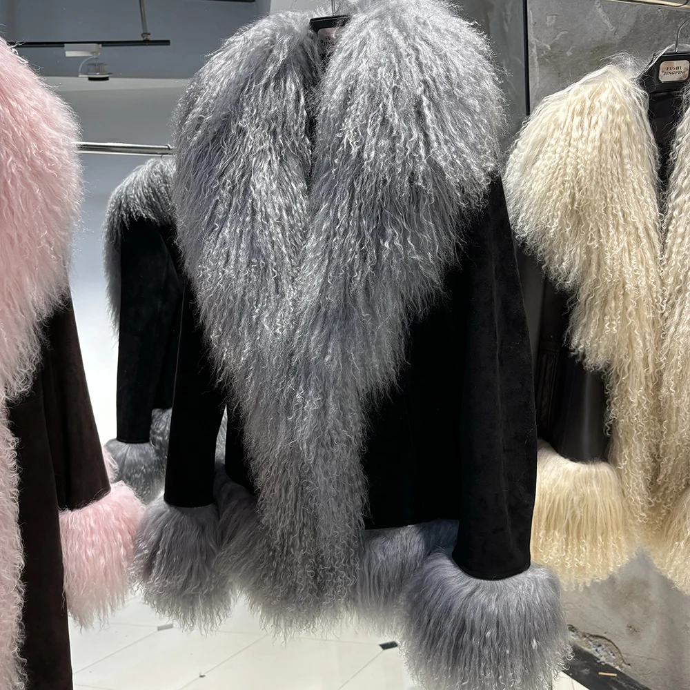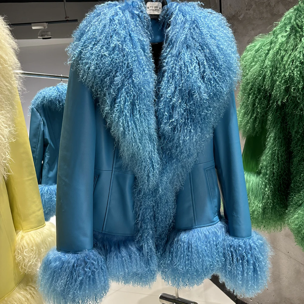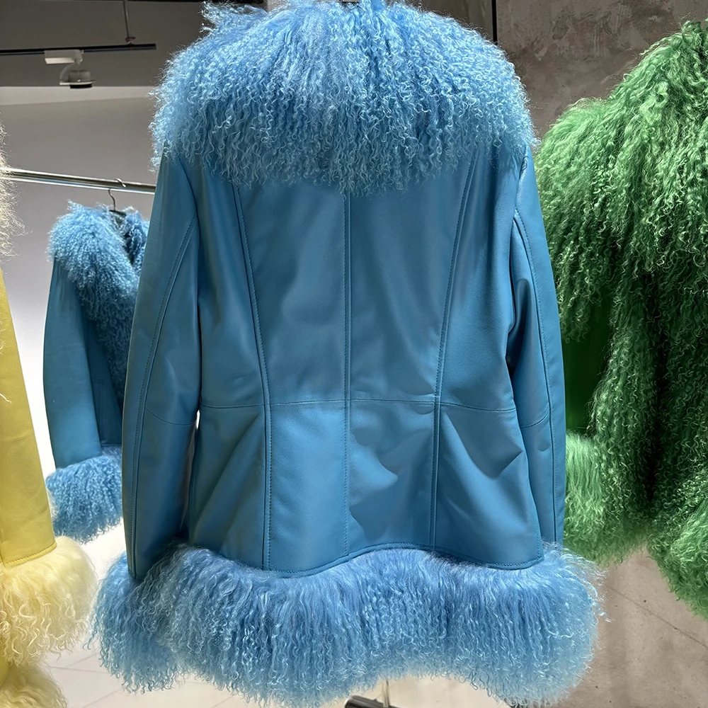 2025 Autumn Women Mongolia Fur Collar Leather Clothes Pink Leather Coat Real Sheepskin Leather Jacket