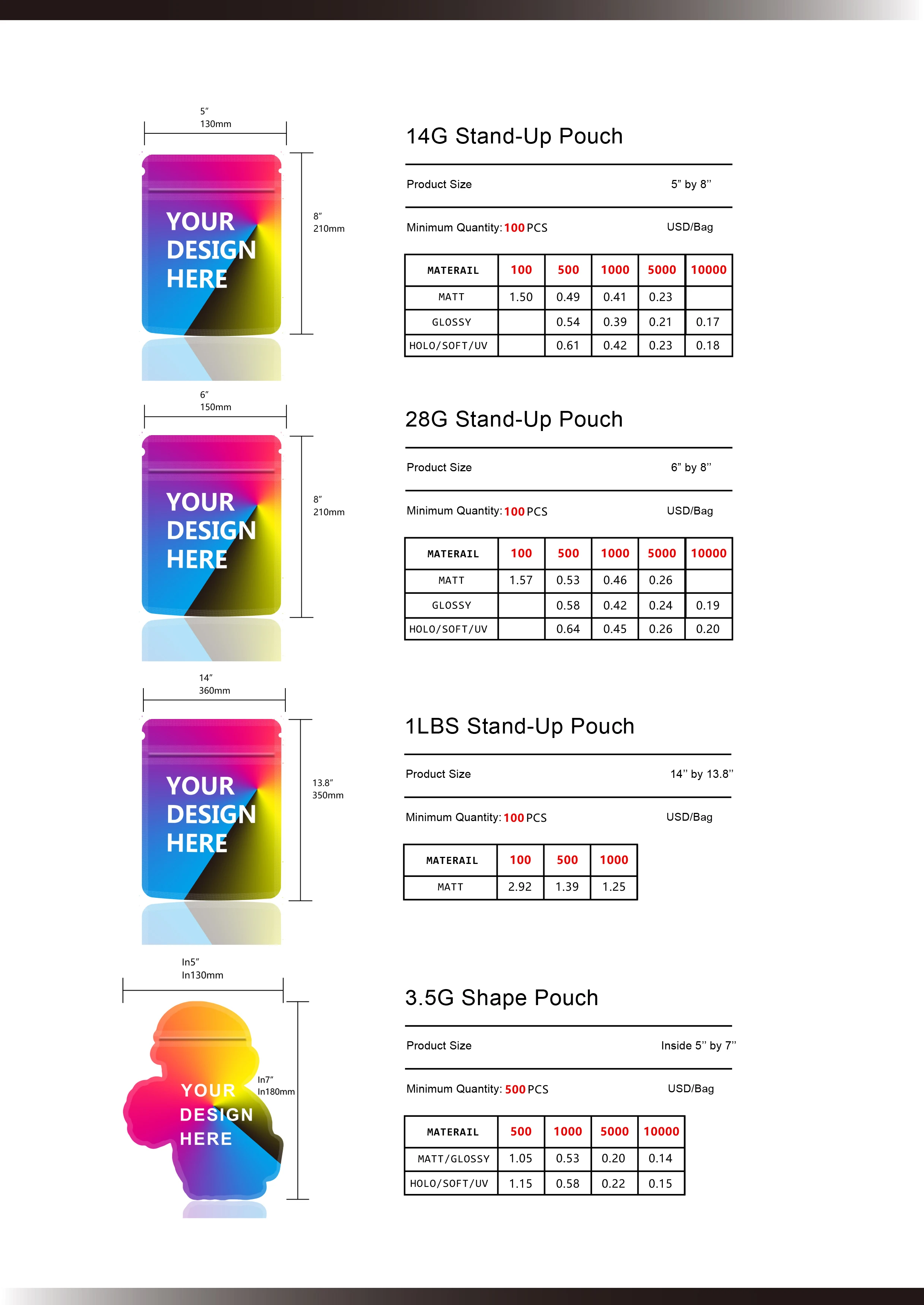 Printing: | 1.gravure printing (Max. 8 colors) customized, printed with the customized designs and logos according to your requirement. MOQ 20,000 PCS. 2.customized sticker (papery/clear plastic) put on stock bags, MOQ 1,000 PCS. 3.hot stamping on stock bags,1 color logo and text, MOQ 1,000 PCS. | |||||||