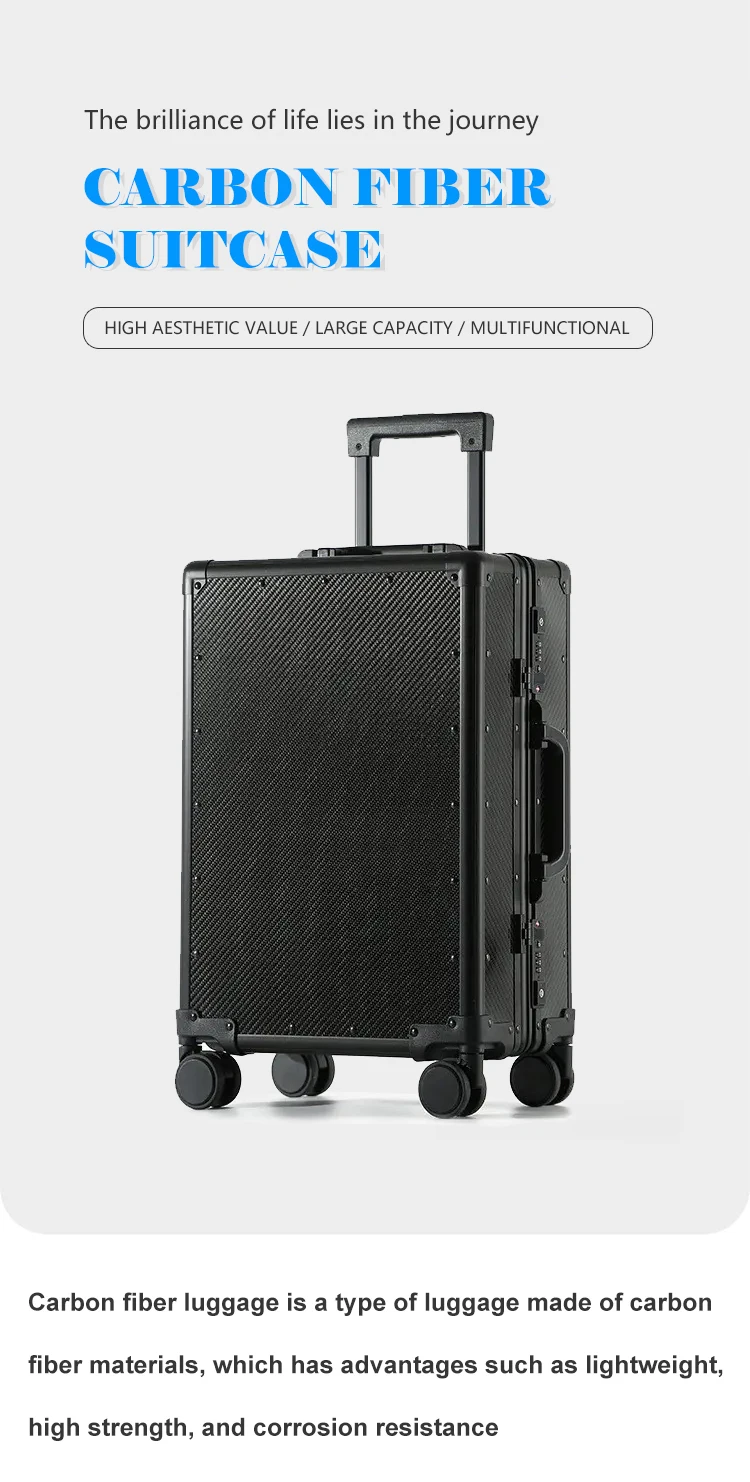 Carbon fiber luggage is a type of luggage made of carbon fiber materials, which has advantages such as lightweight,high strength, and corrosion resistance.