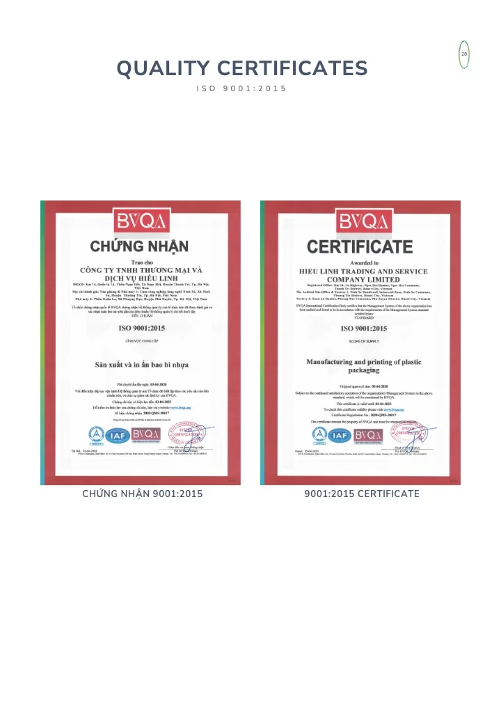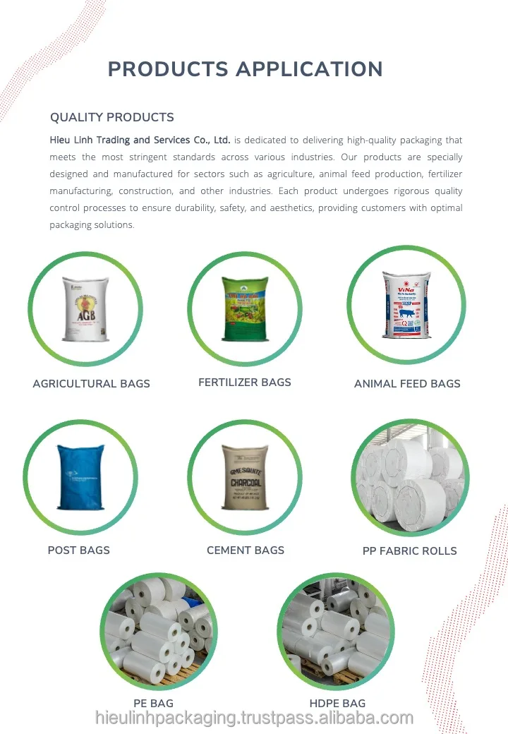 Specializes in designing, manufacturing and supplying all kinds of PP plastic packaging, PP woven packaging, BOPP gravure printing, flexo printing ... used to pack products in the construction, additives and chemical industries. , seeds, fertilizer, animal feed, poultry feed, animal feed, agricultural products (rice, flour, seeds) etc. With over 15 years of experience with modern equipment, professional production lines, skilled technical staff.Hieu Linh Trading and Services Co., Ltd offers the following products: - High quality, guaranteed delivery schedule, reasonable price to meet the different needs of domestic and foreign customers. - Hieu Linh's PP packaging products can currently meet most requirements of strict markets such as Korea, India, Philippines, ...We always strive to research, explore and invest in the improvement and innovation of technology, machinery and quality management methods to best meet the needs and beliefs of customers in the quality of products. products and services of our Company. - With the business philosophy of "Let us succeed with you", we always accompany and consider the interests of our customers to be the benefit of the company, to really understand and help each other overcome difficulties, together. reaching new heights - High responsibility and serious and careful technical supervision to create the perfect products to the smallest details. - In addition, the departments often exchange work, share difficulties and initiatives to build a dynamic, creative and professional Hieu Linh.The success of the company today besides the efforts of the Board of Directors and officials - employees of the company, also has the support of partners, customers. We always remember to be grateful to all customers who have always trusted and accompanied us during the past time.And with the slogan "Challenging the limits" we have been trying to change, create, design the best packaging designs, the best quality, the best service to bring the best products and services. truly valuable to meet the highest needs of our customers. We believe that every effort in the work will bring worthy results and is the golden key that opens the handle.Website: hieulinhpp.comWhatsapp: +84 868883517