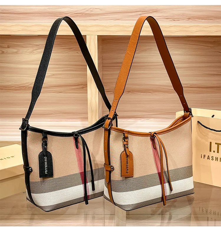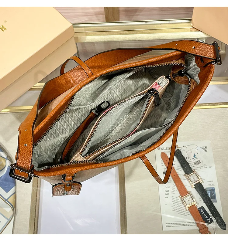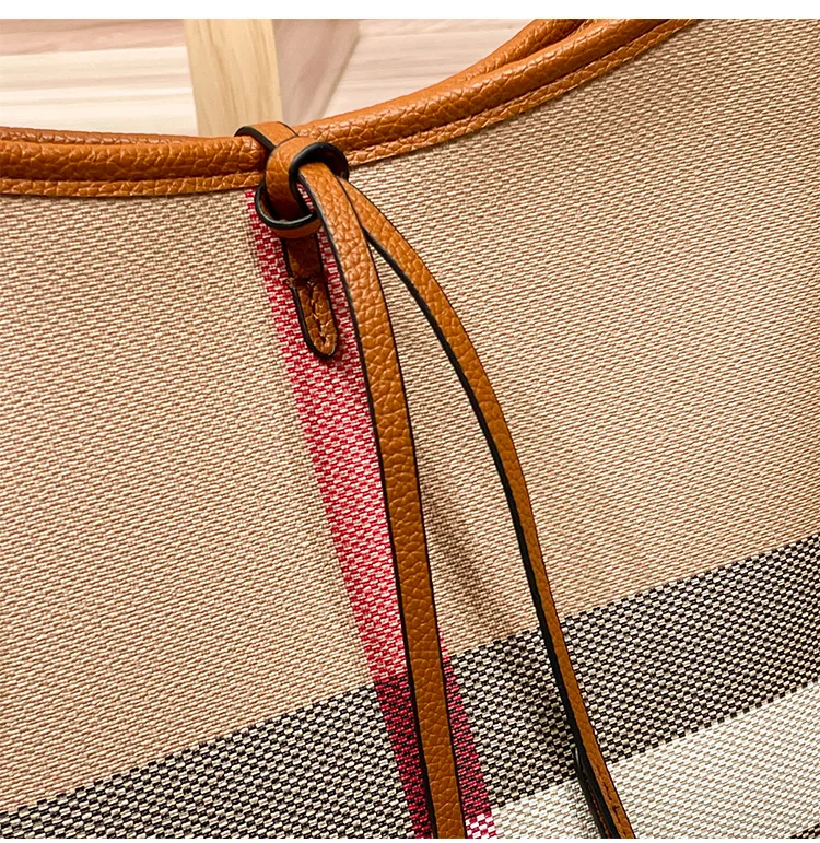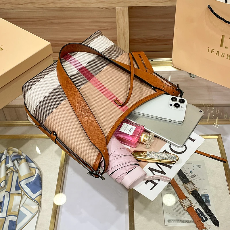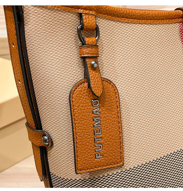 Genuine Leather Women's Bag 2025 New Checkered Canvas Large Capacity Vintage Bag Fashionable Commuting Single-shoulder Tote Bag