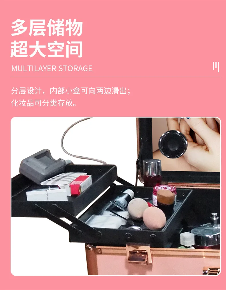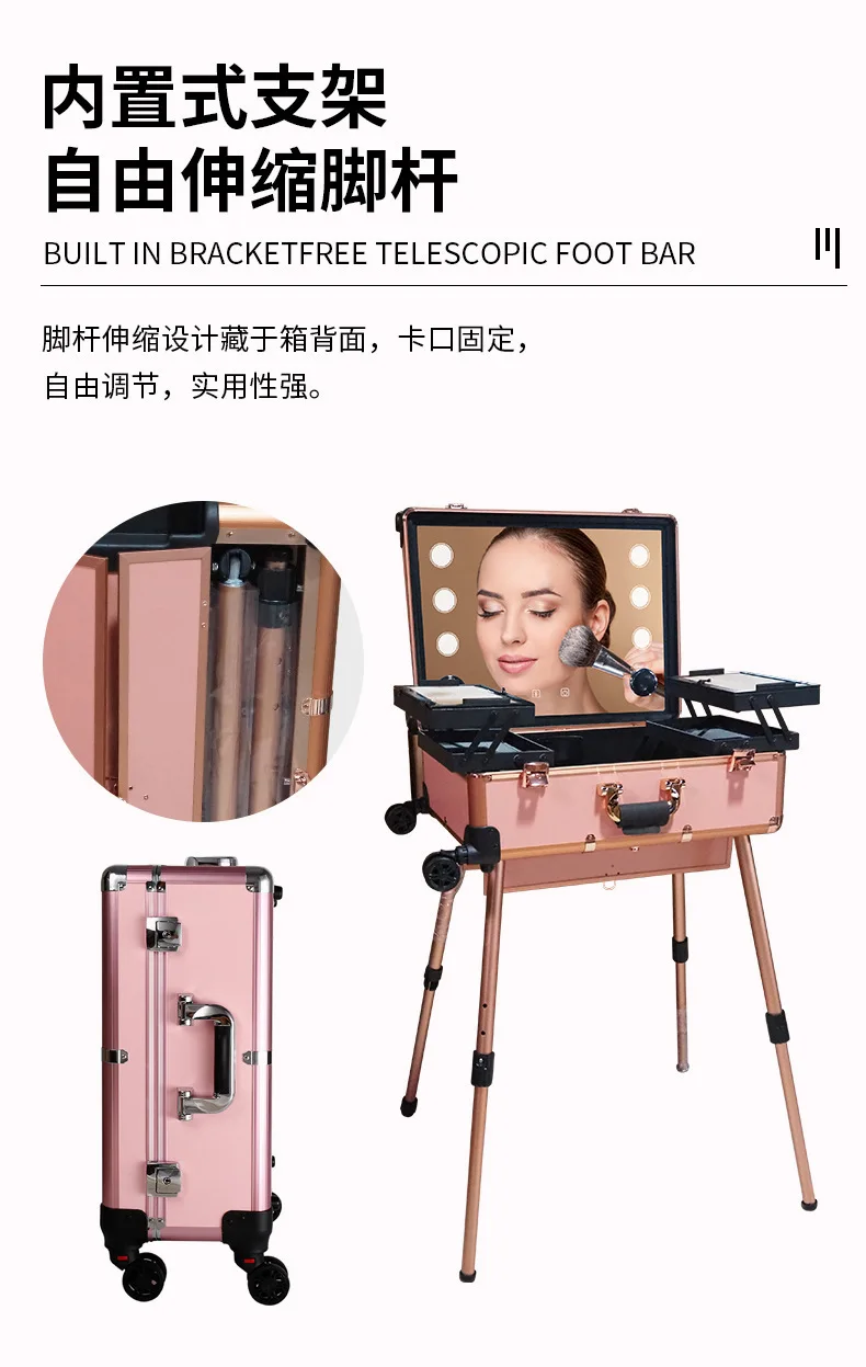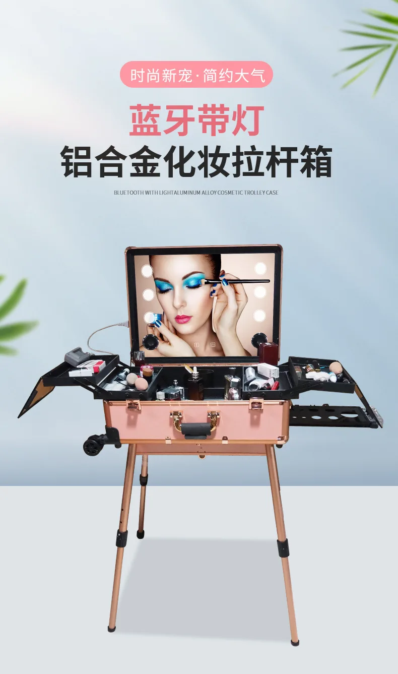Aluminum alloy trolley with light cosmetic box/ table hairdressing embroidery nail kit universal wheel LED professional beauty