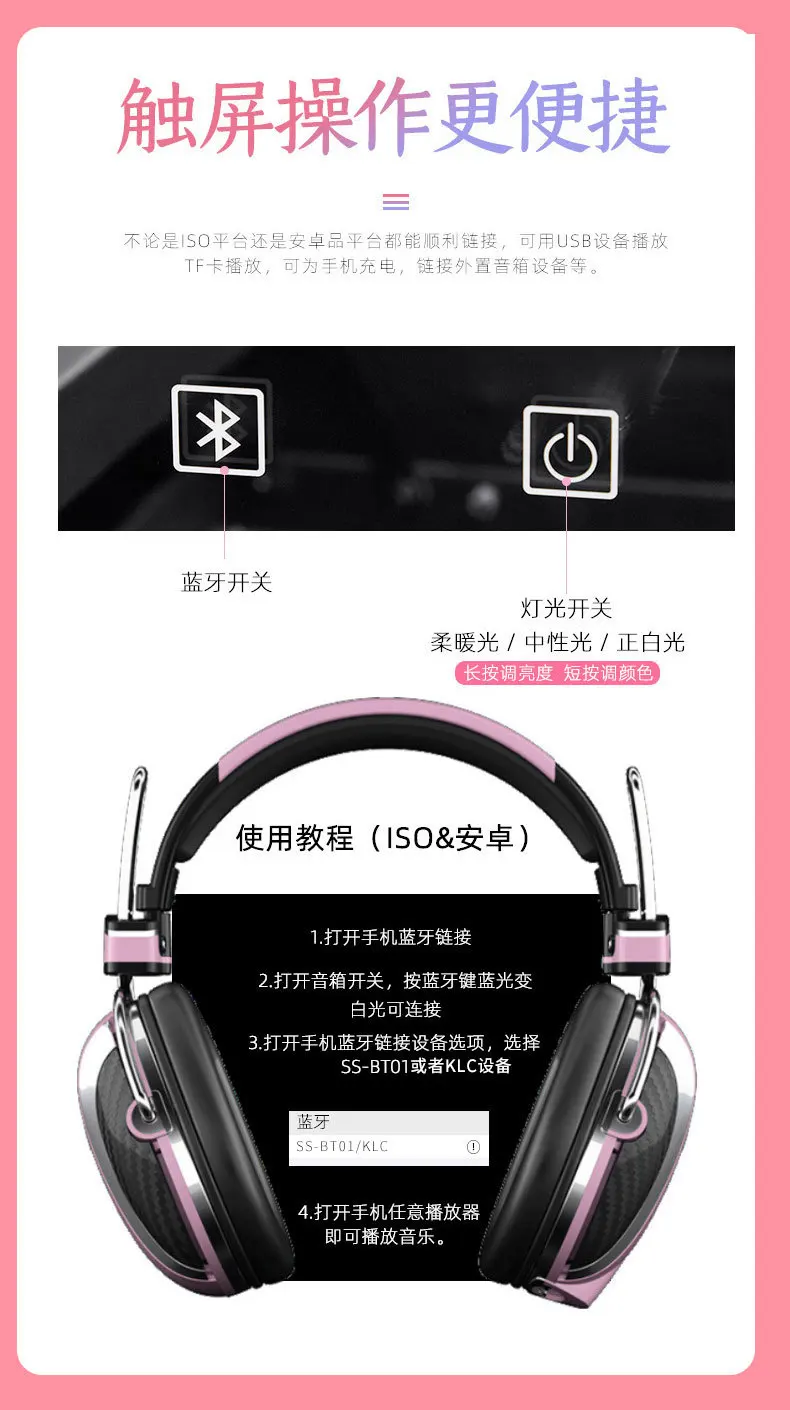| 1 Open the Bluetooth link of the mobile phone 2 Open the speaker switch and press the Bluetooth key to turn blue light into white light for connection 3. Open the Bluetooth link device option of the mobile phone and select SS-BT01 or KLC device | 1 Open the Bluetooth link of the mobile phone 2 Open the speaker switch and press the Bluetooth key to turn blue light into white light for connection 3. Open the Bluetooth link device option of the mobile phone and select SS-BT01 or KLC device |