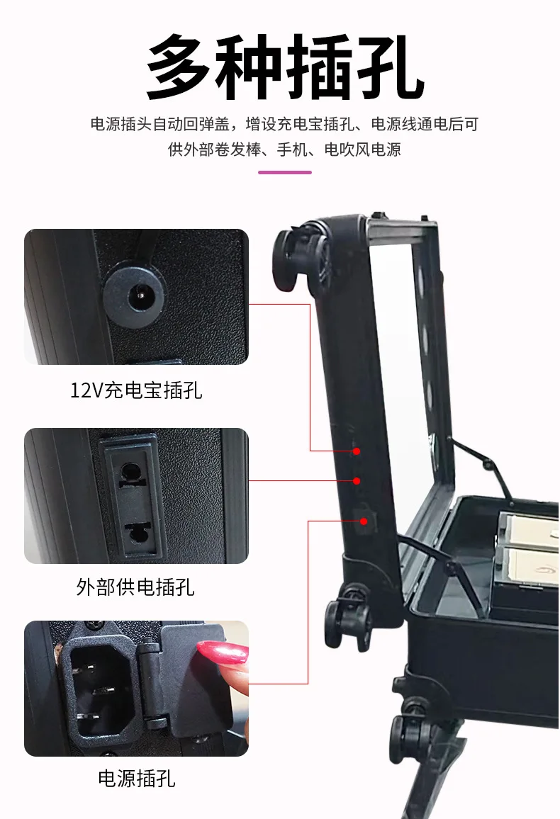 | Multi purpose, create power for professional, release good mood, and only be your makeup assistant | A variety of sockets, power plugs, automatic spring back covers, additional charging bank sockets, power lines can be used for external curling sticks, mobile phones, hair dryers |