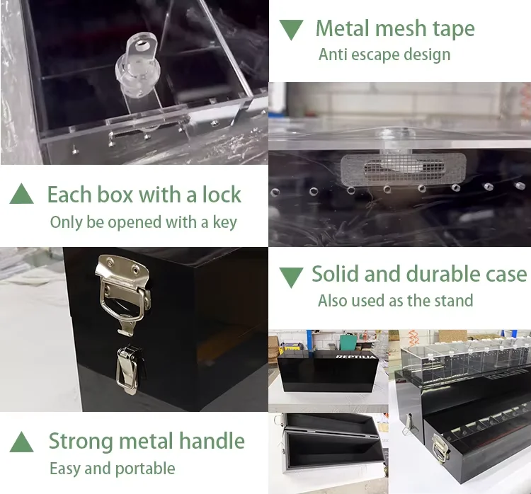 CDD reptile display is nice looking and well designed. Fully clear acrylic is convenient for visitor to observe reptile at close range. One set includes 3 levels of acrylic display and 1 aluminum suitcase. This suitcase holds 3 displays, can also be used as stand when displaying.