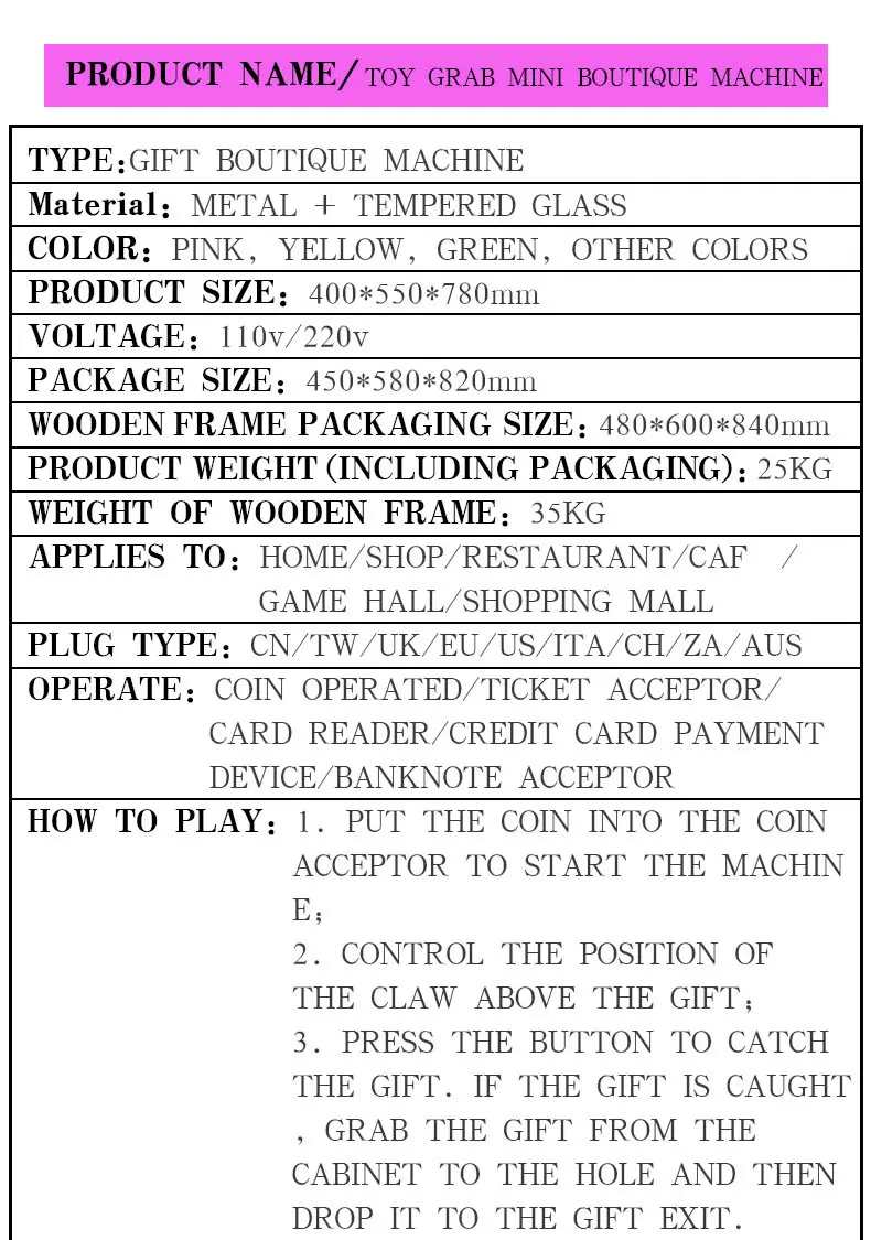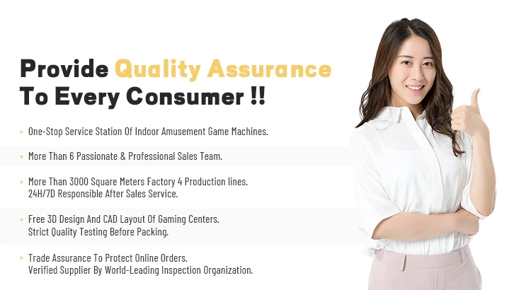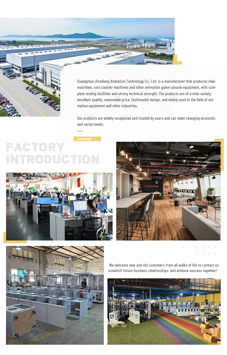 Q1:Who are we?A:We are a manufacturer, based in Guangdong, China, is a research and development, production, sales, service in one of the emerging modern electronic entertainment equipment enterprises. The main products are claw machine, scissors machine, coin exchange machine and other entertainment equipment products professional production.Q2:Can you accept customized services?A:Yes, we accept customization. You can add your logo, name, pictures, etc. to the product.Q3:Whats the MOQ of your products?A:Different machines have different MOQ, generally, we can provide samples for inspection.Q4:How long is the delivery time?A:It depends on the order quantity, order details and production status. Styles that are in stock can be shipped after placing an order. Other models usually takes about 7-10 days. The peak season takes about 30 days.Q5:How can we guarantee quality?A:We always have pre-production samples before mass production and final inspection before shipment.Q6:How long is the warranty period?A:The motherboard and crane motor power box have a one-year warranty, the whole machine lifetime after-sales.Q7:How to secure our payment?A:We can do Alibaba trade insurance order.Q8: Is there any discount as per order quantity?A:Sure. Feel free to consult with us for details.