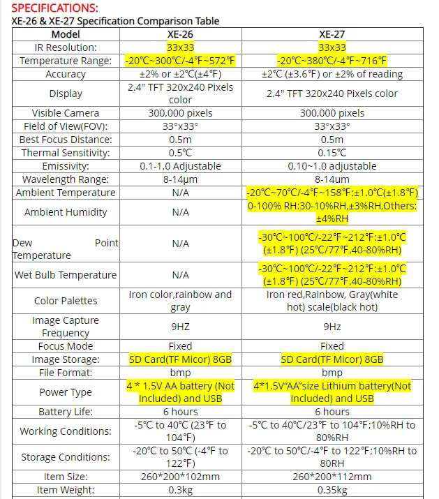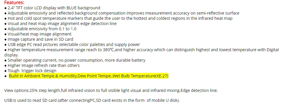 Package Includes: | 1 * Infrared Thermal Imager 1 * Mini USB Data Cable 1 * 8GB Mobile U Disk 1* Card Reader 1* Screw Tool 1 * User Manual 1 * Gift Box | 1 * Infrared Thermal Imager 1 * Mini USB Data Cable 1 * 8GB Mobile U Disk 1* Card Reader 1* Screw Tool 1 * User Manual 1 * Gift Box |