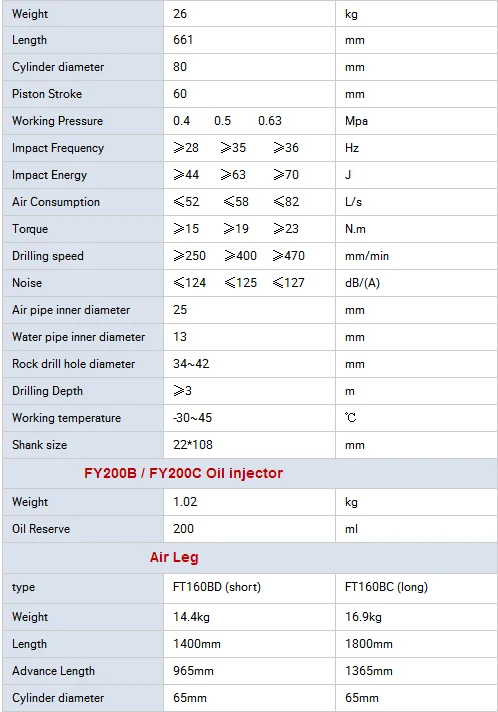 It is suitable for drilling and blasting under various of rocks at any direction angles. Blast hole dia is 34-42mm and depth 5 m. This machine could match with short air leg or long air leg.