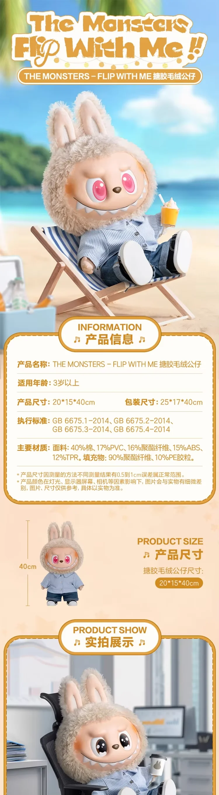 Wholesale 100% Original POP MART 37cm Labubu Flip with Me Figure Vinyl Face Plush Doll Large Animal Figure Model Cute Doll