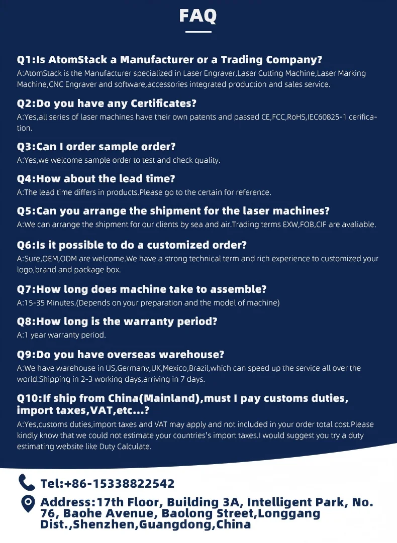 1.Direct Factory:20000+m2 factory area;2.OEM/ODM :flexible OEM/ODM Service able to fit your requiryments and visual identify;3.One-Stop Solution:get all your laser machine needs in ATOMSTACK;