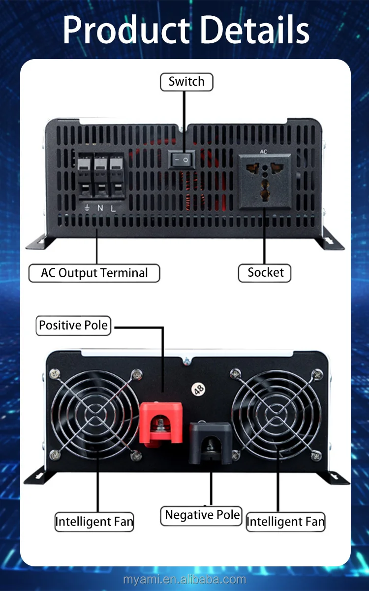 MYAMi 5000W Pure Sine Wave Power Inverter High Quality 24V-96V DC to 110VAC 220VAC for Solar System Car & Home Appliance