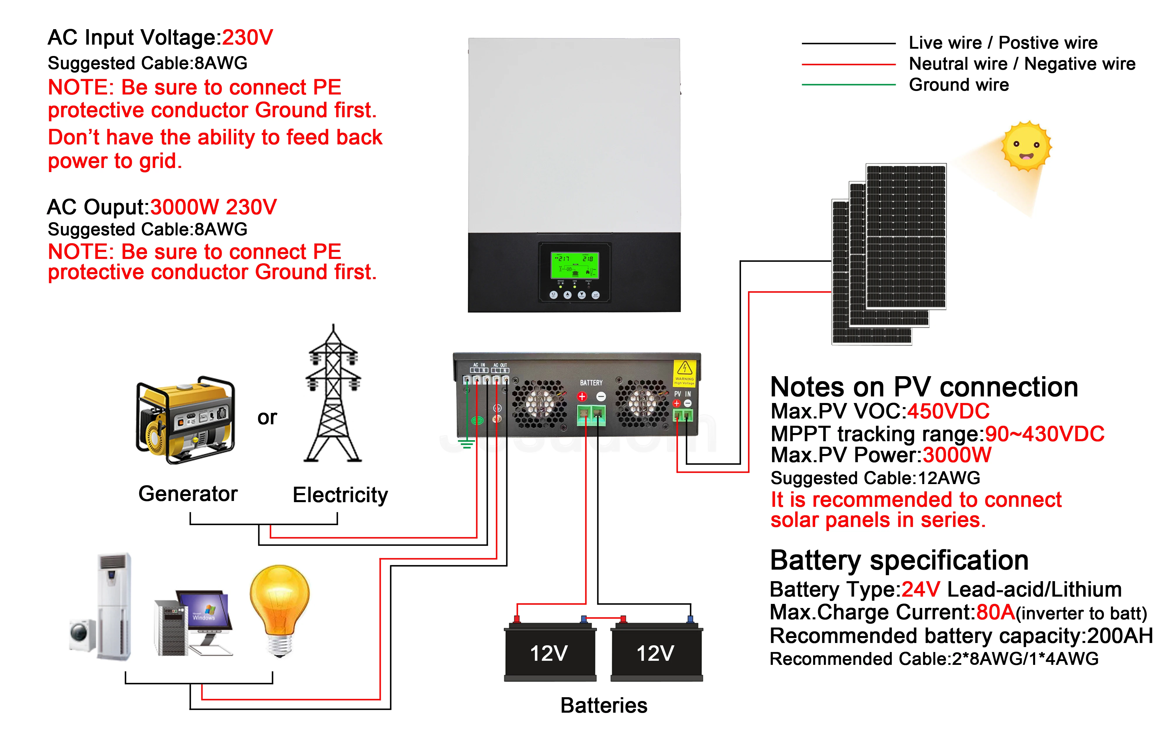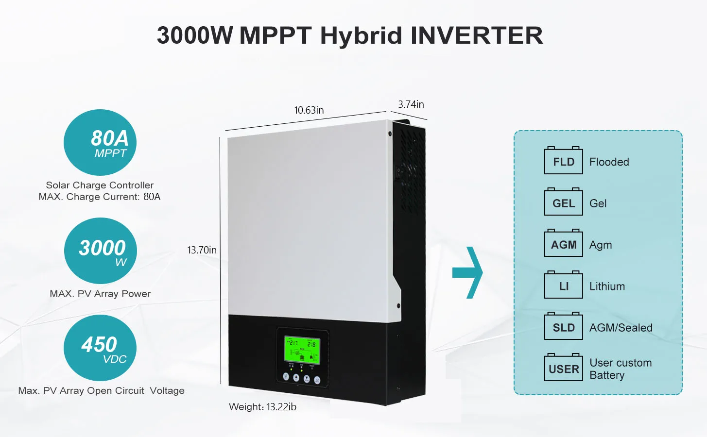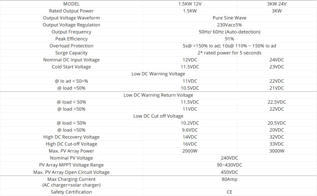 Product Name | 3KW MPPT Hybrid Inverter 24V 80A Solar Hybrid Inverter 230V On off Grid Hybrid Inverter Pure Sine Wave Inversor |