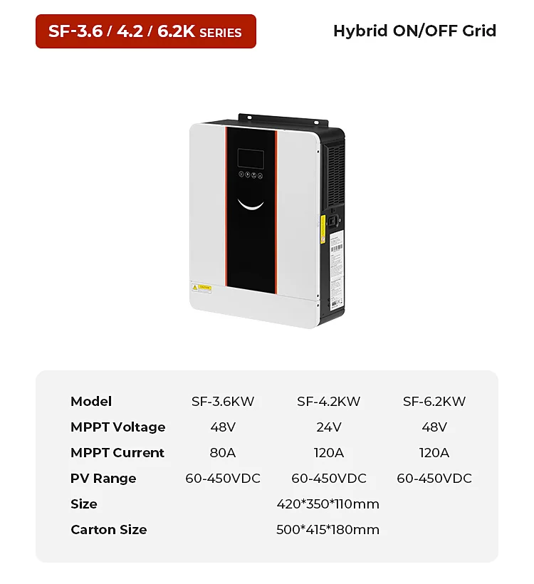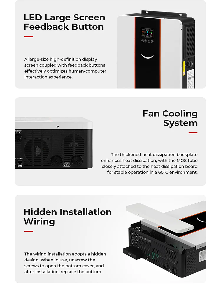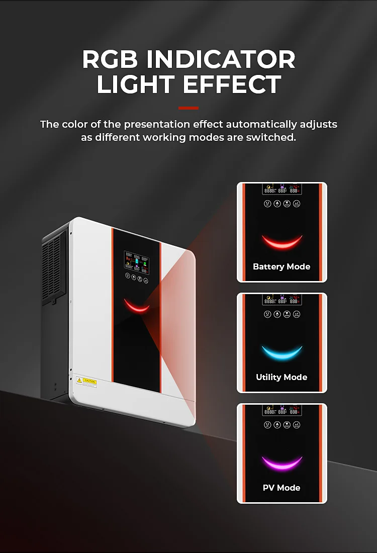 - High Efficiency and Reliability: This 3kw off-grid solar inverter is designed for long-lasting performance with an inverter efficiency of 95% and MPPT efficiency of 98-99%, ensuring maximum energy harvesting from your solar panels.