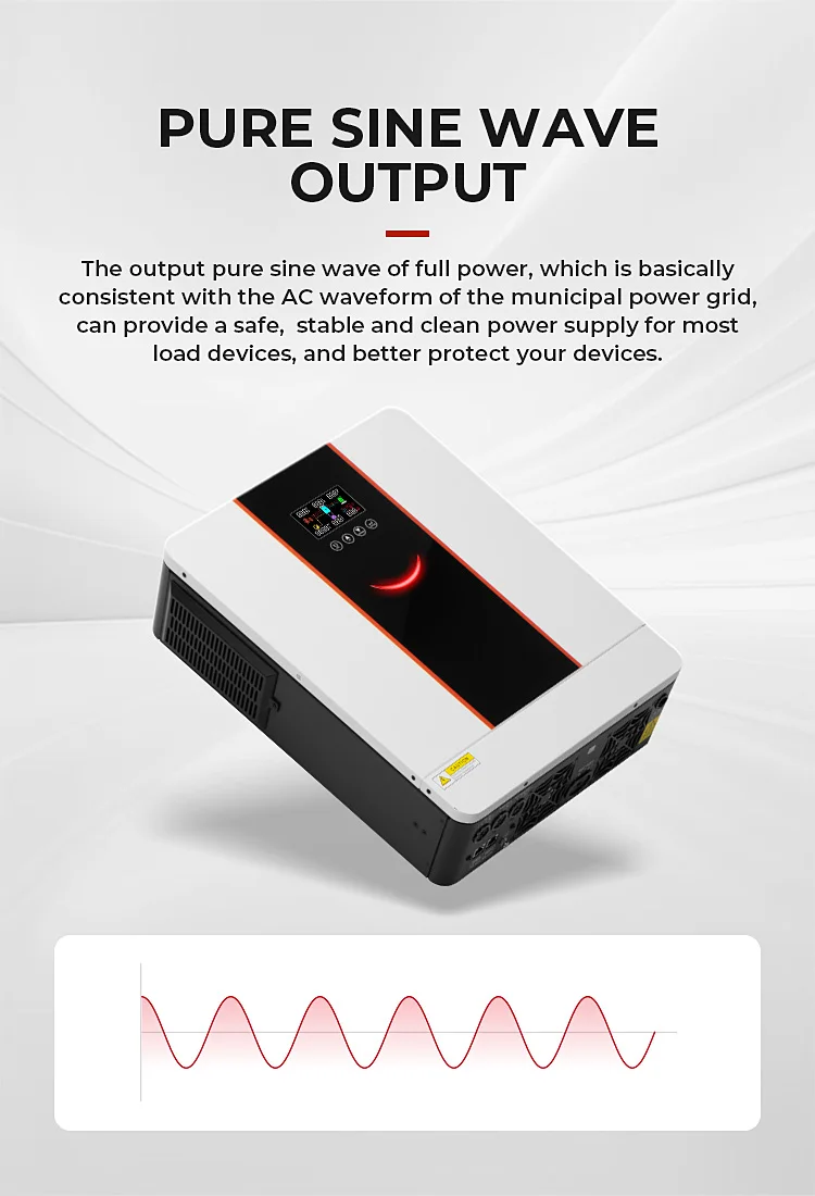 - Pure Sine Wave Output: The inverter provides a pure sine wave output, ideal for sensitive electronics and appliances, ensuring a stable and efficient power supply.