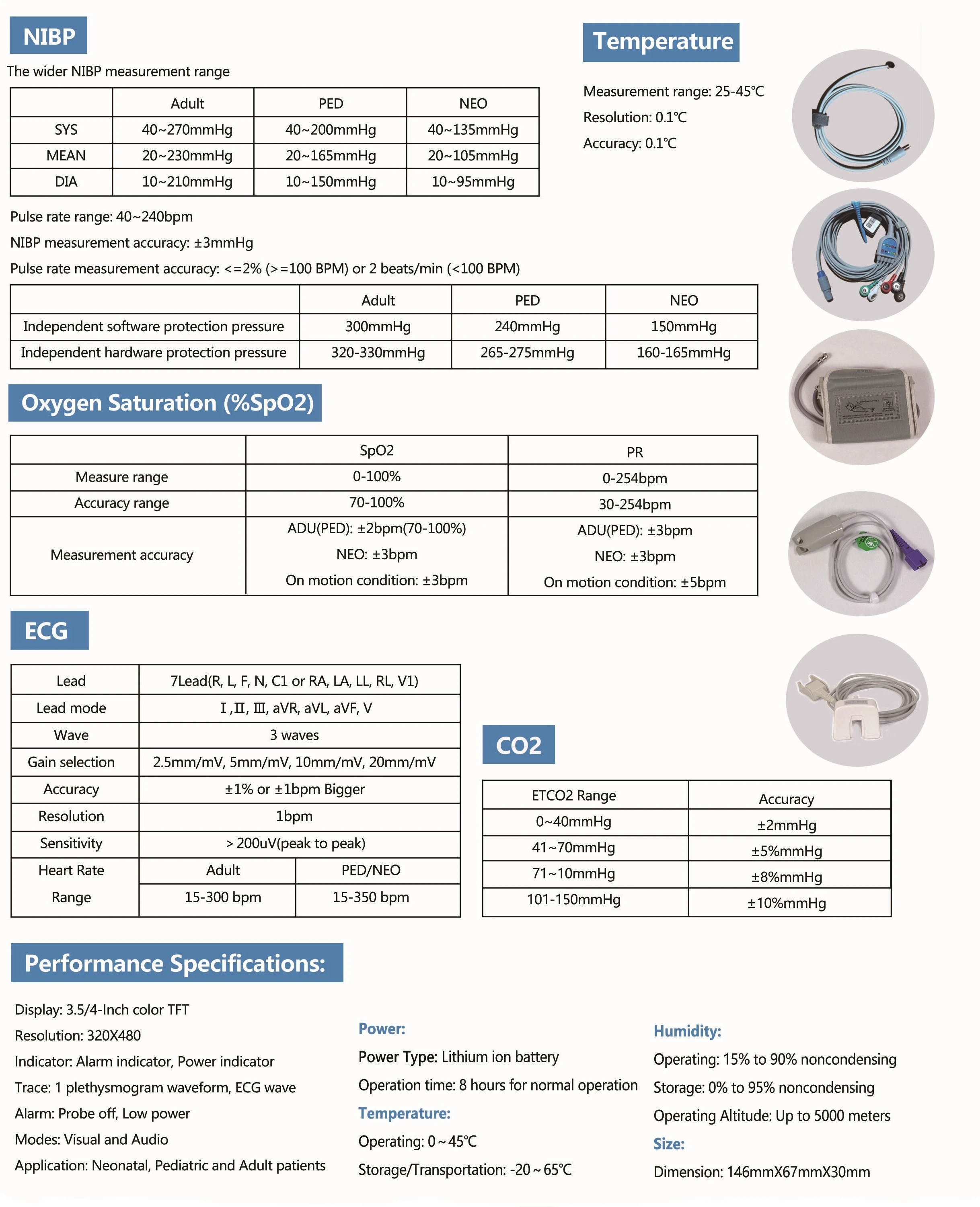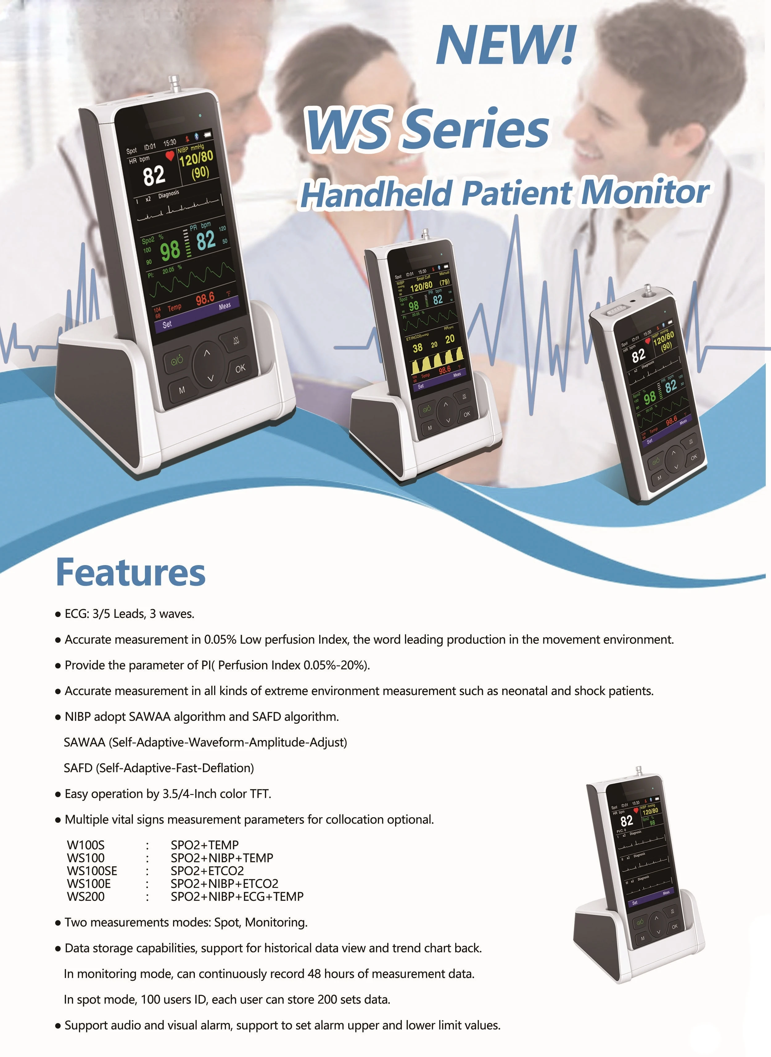 Performance parameter: | 1.The smallest and exquisite handheld vital sign monitor in the worldwide 2.Accurate measurement in 0.05% Low perfusion Index,the world leading production in the movement environment 3.Provide the parameter of PI( Perfusion Index 0.05%-20%) 4.Accurate measurement in all kind of extreme environment measurement such as neonatal and shock patients 5.NIBP adopt SAWAA(Self-Adaptive-Waveform-Amplitude –Adjust)algorithm and SAFD(Self-Adaptive-Fast-Deflation)algorithm 6.Easy operation by 3.5 inch color TFT 7.Multiple vital signs measurement parameters for collocation optional WS100: NIBP,Spo2,Temp 8.Up to 100 users ID switch 9.Two measurements mode:Spot,Monitoring 10.Data storage capabilities, support for historical data view and trend chart back for checking 11.In monitoring mode, can continuously record 48 hours of measurement data 12.In spot mode,100 users ID, each user can store 200sets data 13.Support audio and visual alarm,support to set alarm upper and lower limit values 14.Lithium ion battery power supply |