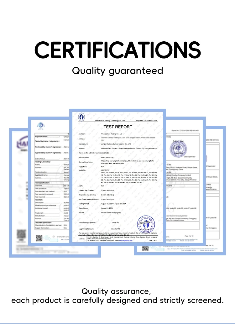 Strict quality control. Every plush toy goes through multiple quality inspection checkpoints during the production process to ensure that the product meets national quality standards and customer requirements. From appearance inspection to filling uniformity inspection, from sewing firmness test to safety assessment, we do not miss any details and strive to provide customers with the best quality products.