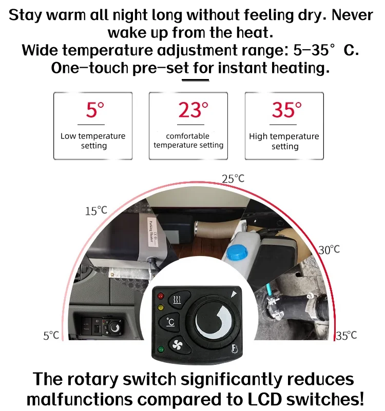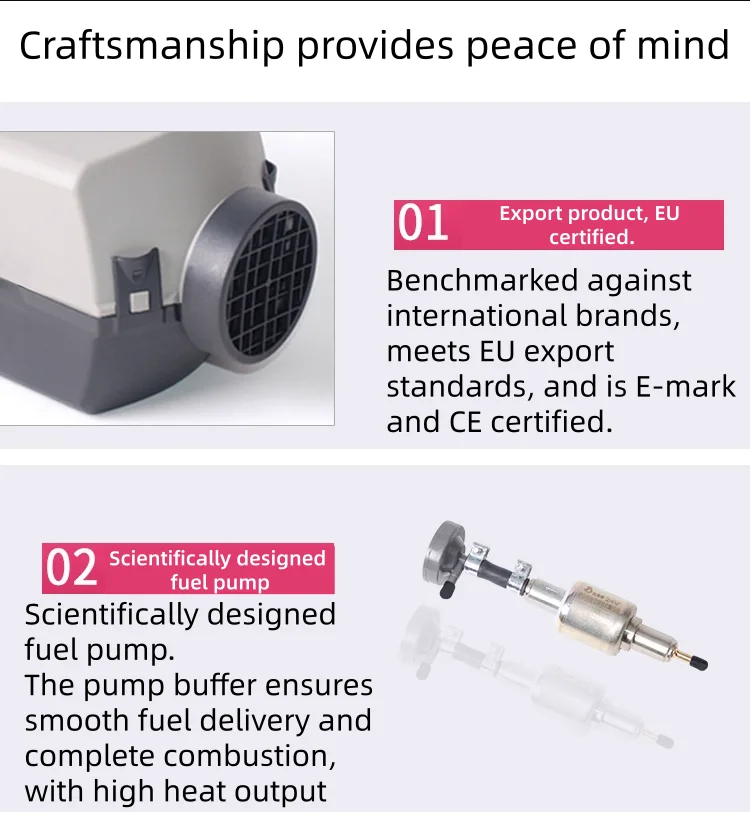The 12V 8KW diesel air heater can achieve fast heating even in -40℃ environment, quickly eliminating frost on the car windows. The noise is also effectively reduced through blower speed control, silent fan and oil pump.