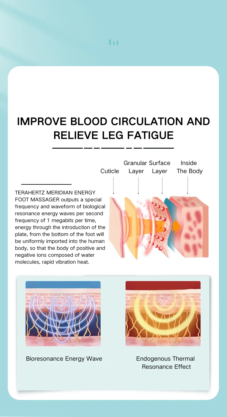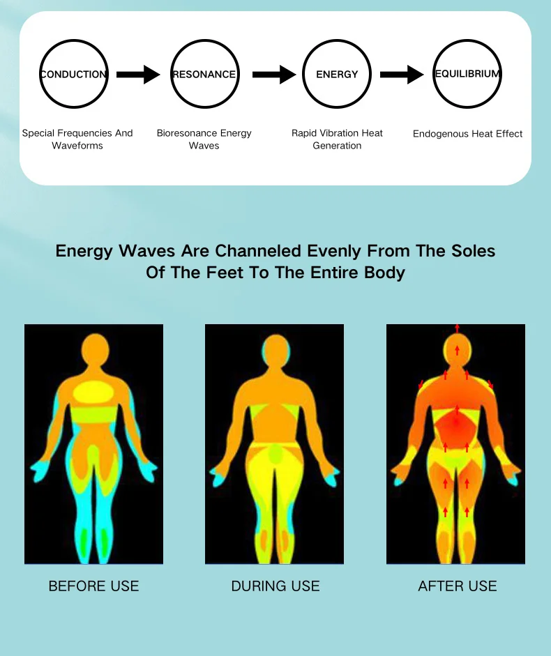 Terahertz physiotherapy device outputs special frequency and waveform of biological resonance energy wave, through the sensing energy introduction plate, the energy wave from the soles of the feet into the body uniformly, so that the body's cells quickly rotate and generate heat.