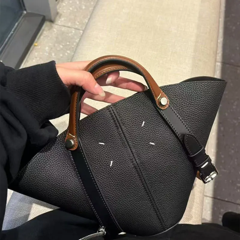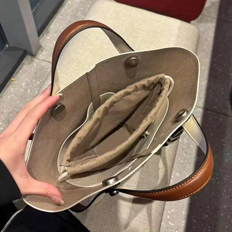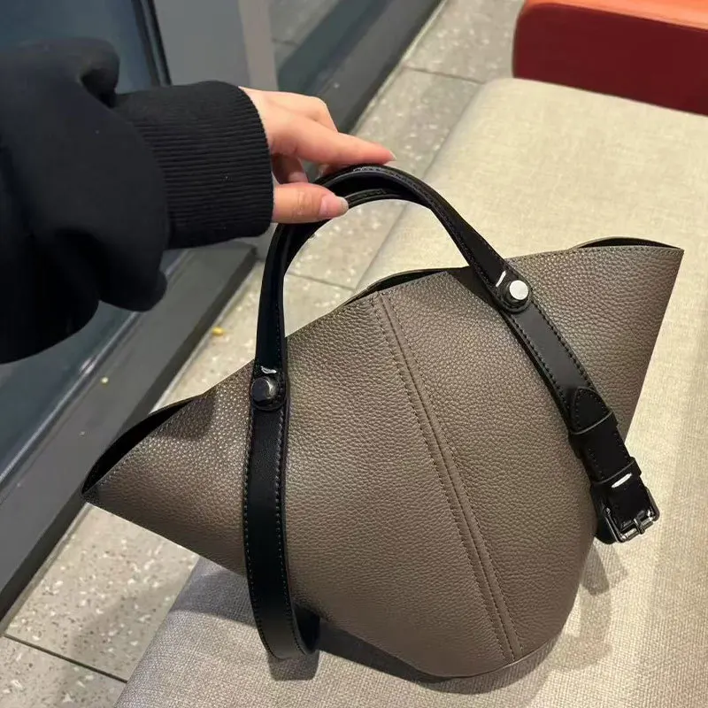 Women's Large Capacity Cowhide Leather Bucket Handbag New Style Open Closure Personalized Fan-Shape Basket Tote Bag