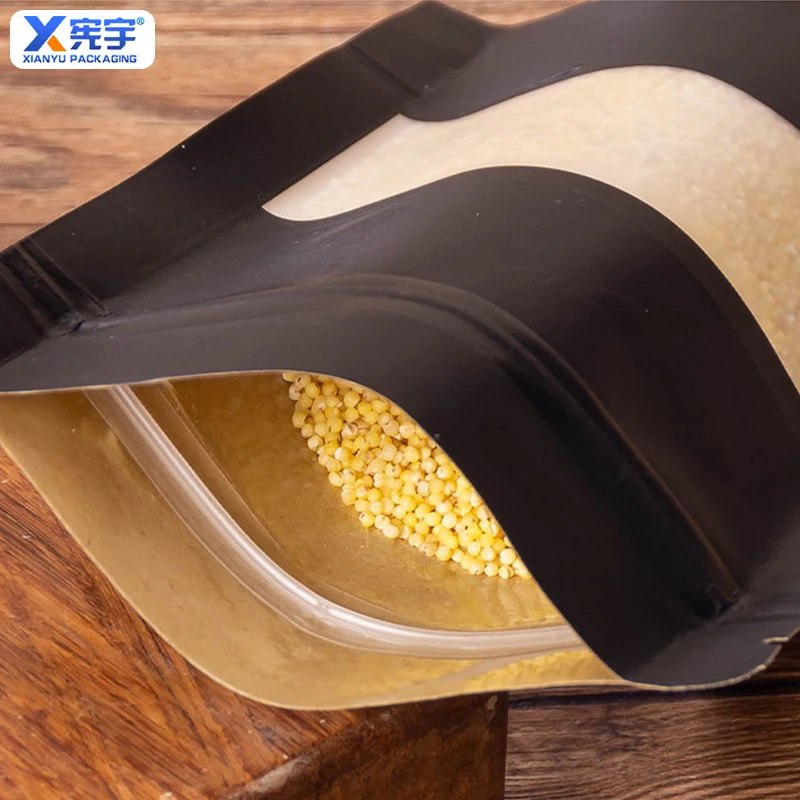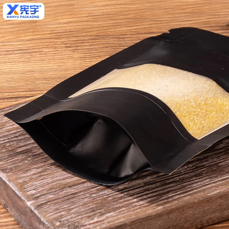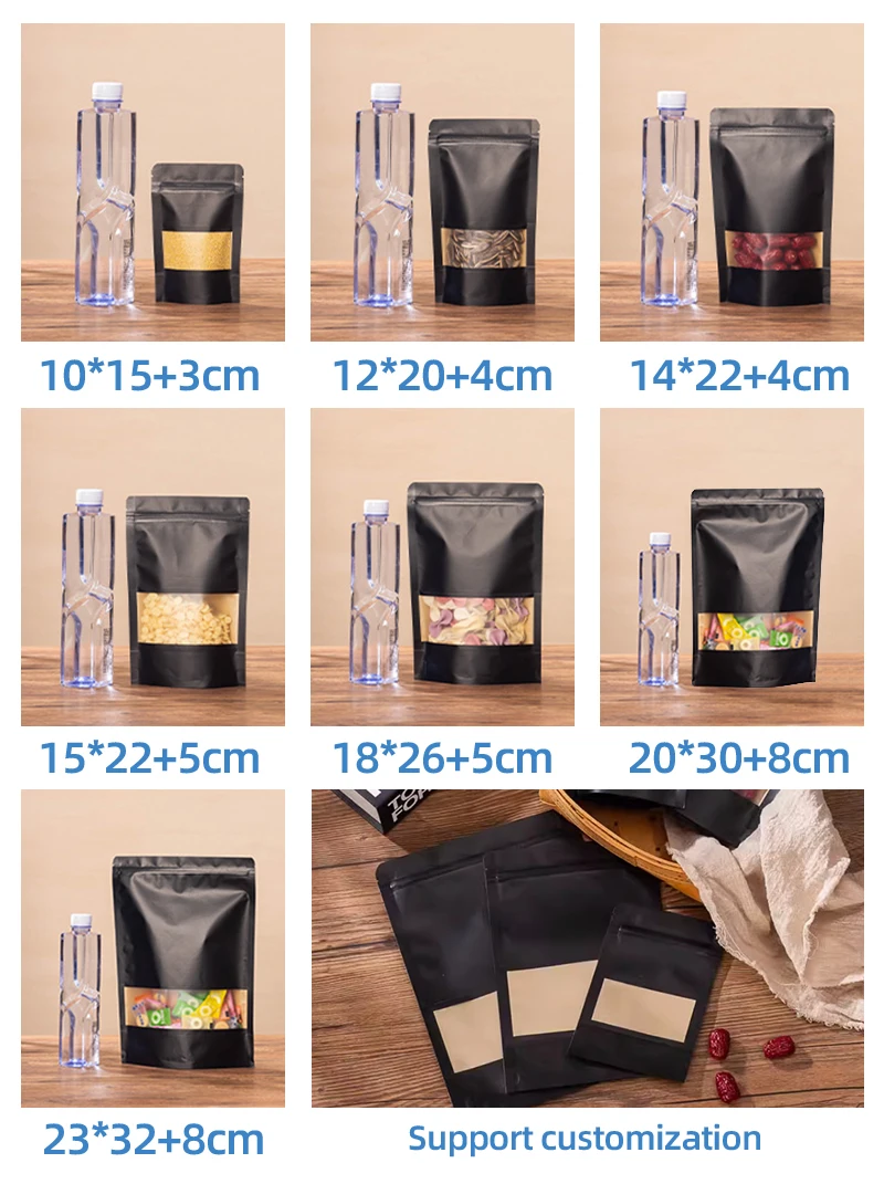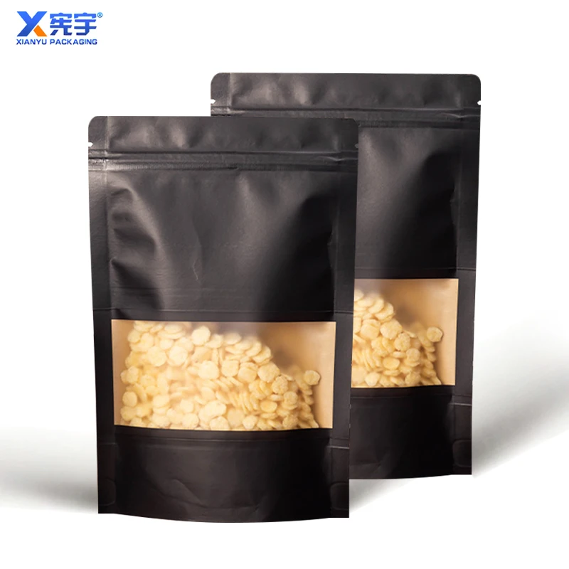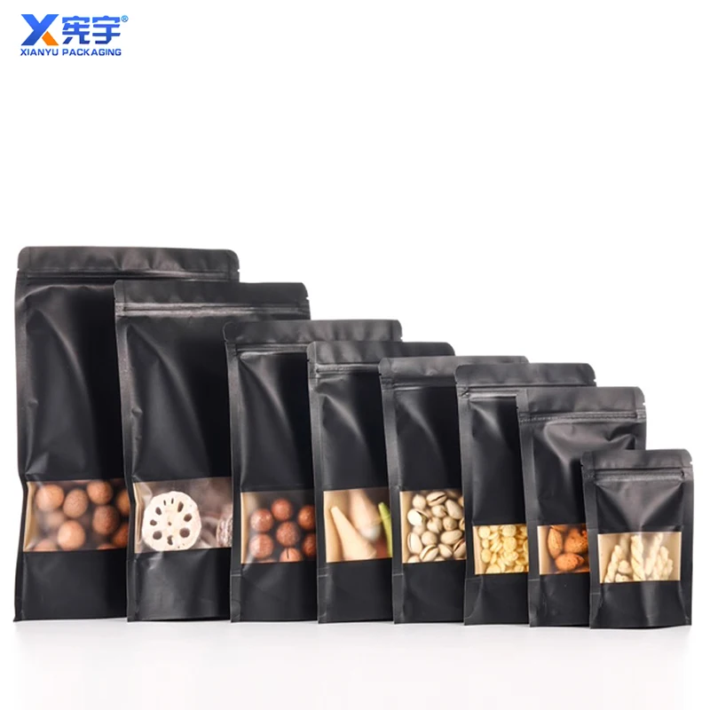 Black Kraft Paper Zipper Food Bag Moisture Proof Plastic Stand up Paper Bag With Windows Customizable Logo